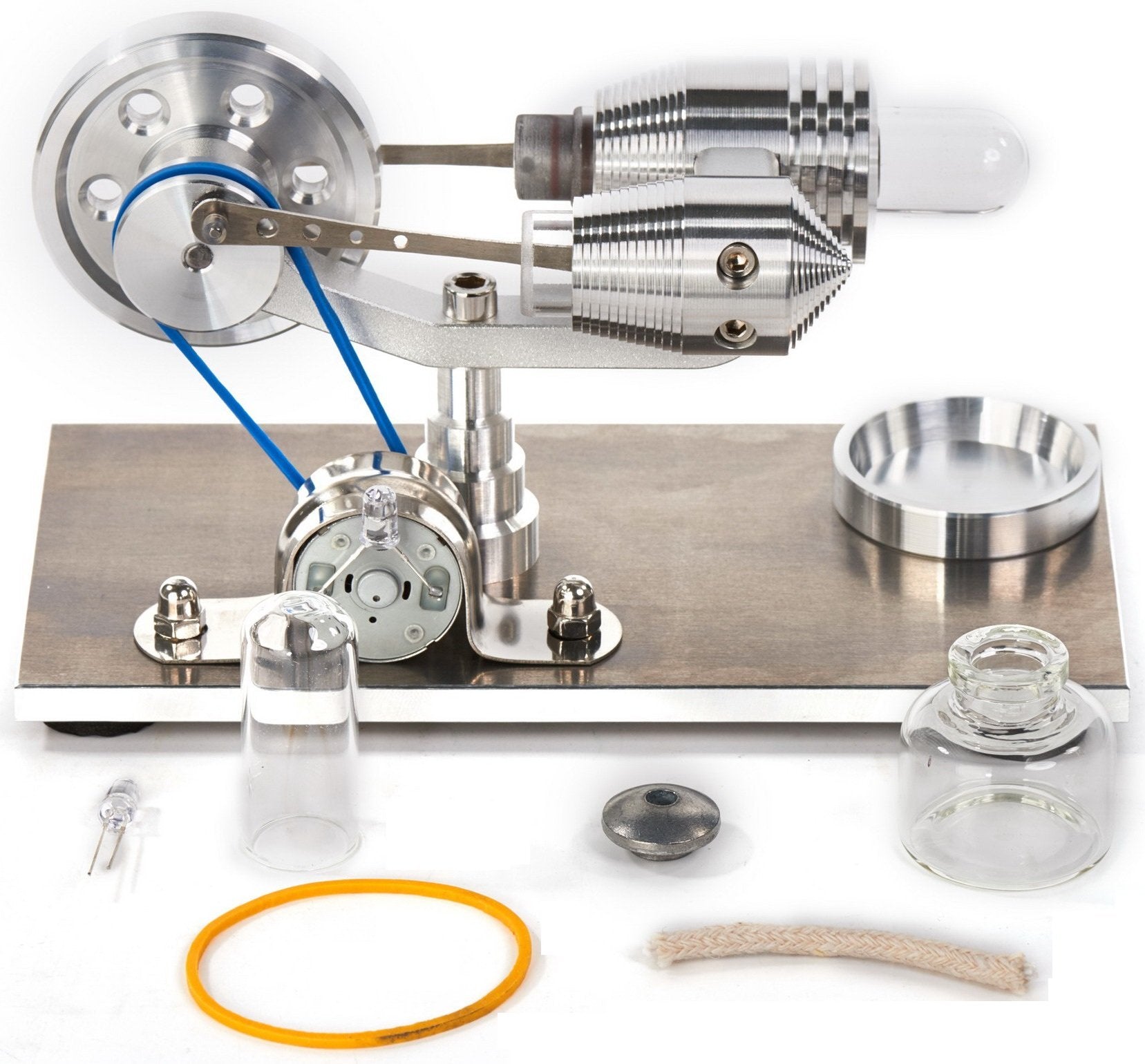 - Q: How does the Sunnytech Hot Air Stirling Engine work? A: The Sunnytech Hot Air Stirling Engine operates by heating a cylinder with high-grade alcohol, which causes the air inside to expand and contract, driving the flywheel and generating kinetic energy. This energy can also be used to power the multicolor LED light, making it a fascinating educational toy.
