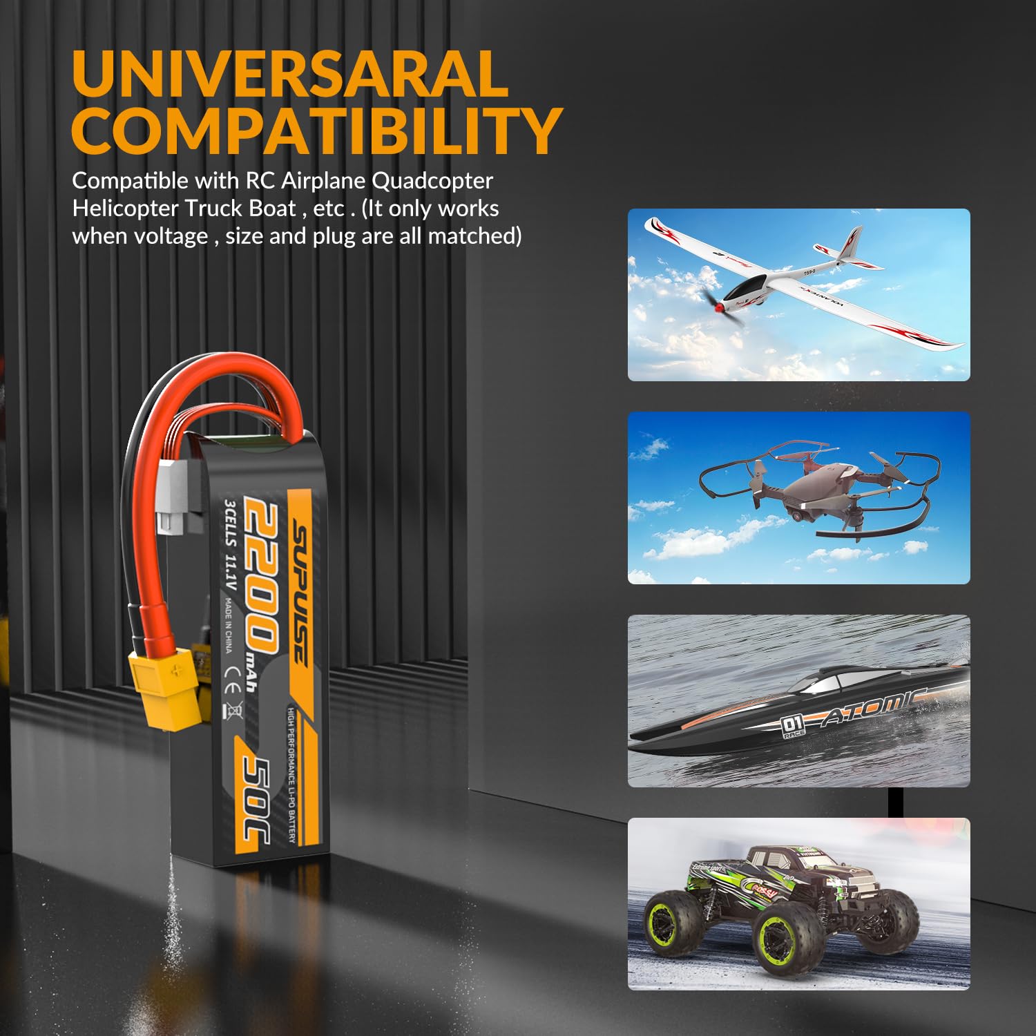 - Q: Is this battery suitable for my RC airplane or helicopter? A: Yes, the SUPULSE 3S 2200mAh Lipo Battery is designed for use with various RC models, including airplanes, helicopters, boats, cars, and trucks, making it a versatile choice for enthusiasts.