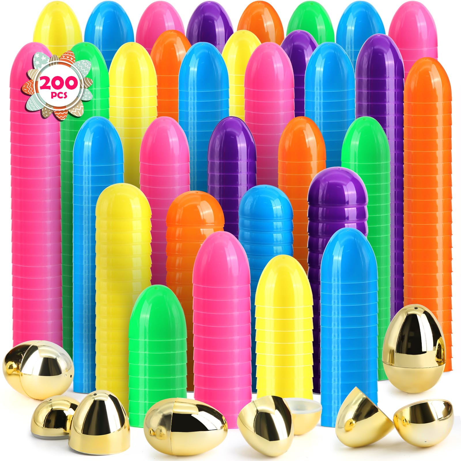 Surcvio [6 Surprise Golden Eggs] 200 Pack 2.3 Inch Plastic Easter Eggs, Empty Easter Eggs Fillable, Bright Colors Plastic Eggs B