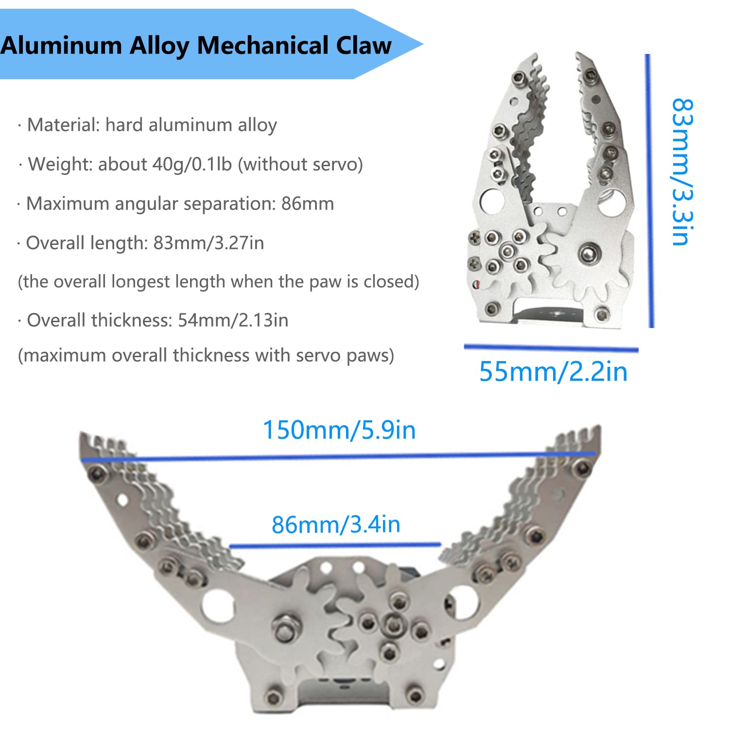 - Q: What are the dimensions and weight of the gripper? A: The gripper measures approximately 83mm in overall length, 150mm in maximum width when open, and weighs about 40g without the servo.