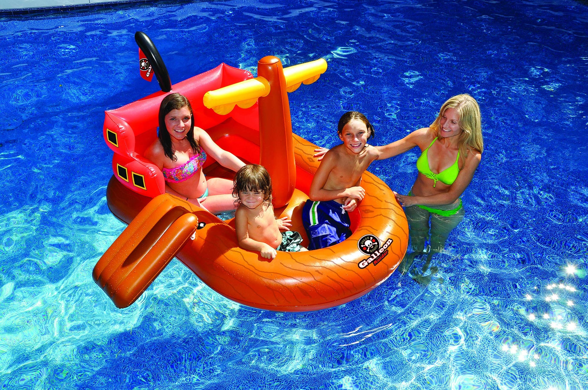 Product DescriptionStart some pirate action on the high seas with the Galleon Raider inflatable pool toy. It will provide kids with hours of imaginative pool play. There is plenty of seating for many pirates on this inflatable ship complete with its own plank-style slide. Kids will love the cool graphics and swim-through seats for quick escapes. The main body of this floating pool toy is shaped like a large pirate ship and has multiple air chambers for safety and a smooth ride. It's even big enough for multiple kids to climb, so you can really get your pool party going. When you're done, you can deflate it quickly and pack it up.From the ManufacturerPirate Action on the high seas of the pool. The Galleon Raider Inflatable Pool Toy will provide kids with hour of imaginative pool play. Plenty of seating for many pirates on this inflatable ship complete with its own gang plank slide. Kids will love the cool graphics, the rope surround, and swim-through seats for quick escapes. Cast away and see where the adventure takes your kids today.