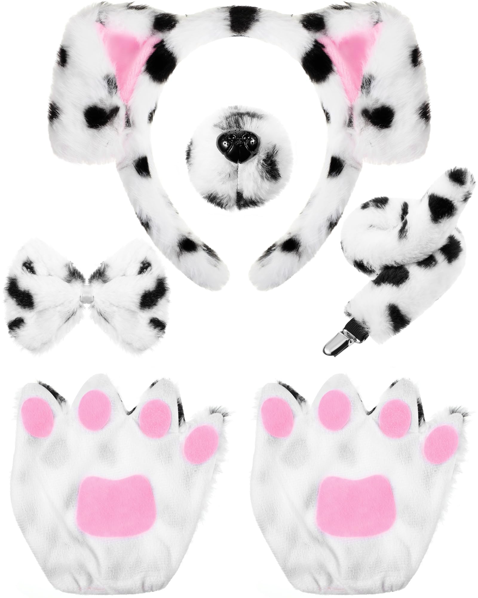 • Q: What is included in the Syhood Puppy Dog Costume Set? A: The Syhood Puppy Dog Costume Set includes a puppy ears headband, a bow tie, a long tail, a fake nose with an elastic belt, and a pair of dog paw gloves. This complete set allows you to create an adorable dog look for Halloween or any costume party.