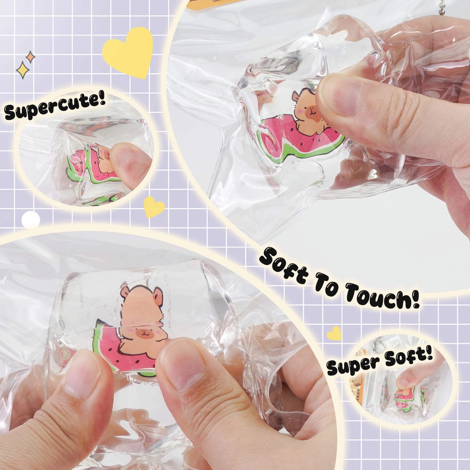 The squishy is cute and soft jelly that fits perfectly in the palm of the hands. It is placed in a transparent bag and the small balls and other small accessories inside are placed manually so the color size and style are random. These stress balls for mature-themed can be easily tucked into pockets backpacks bags etc. as travel toys!
