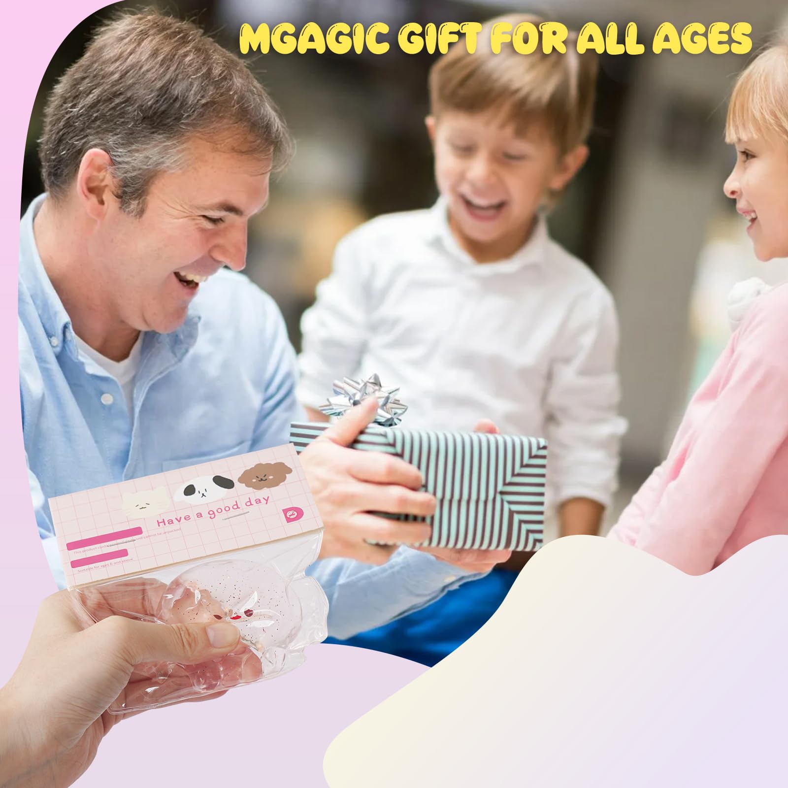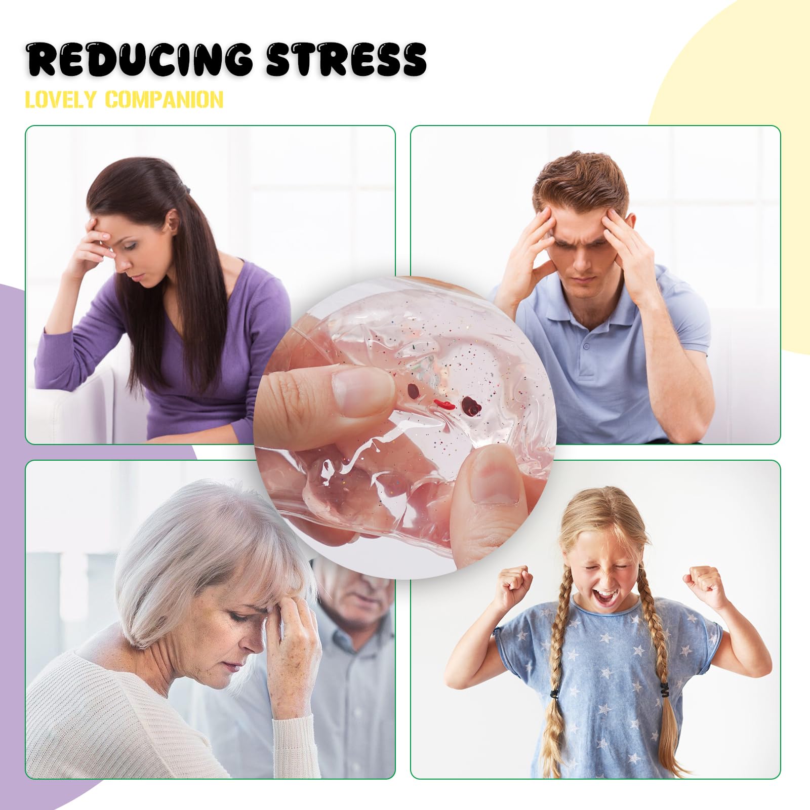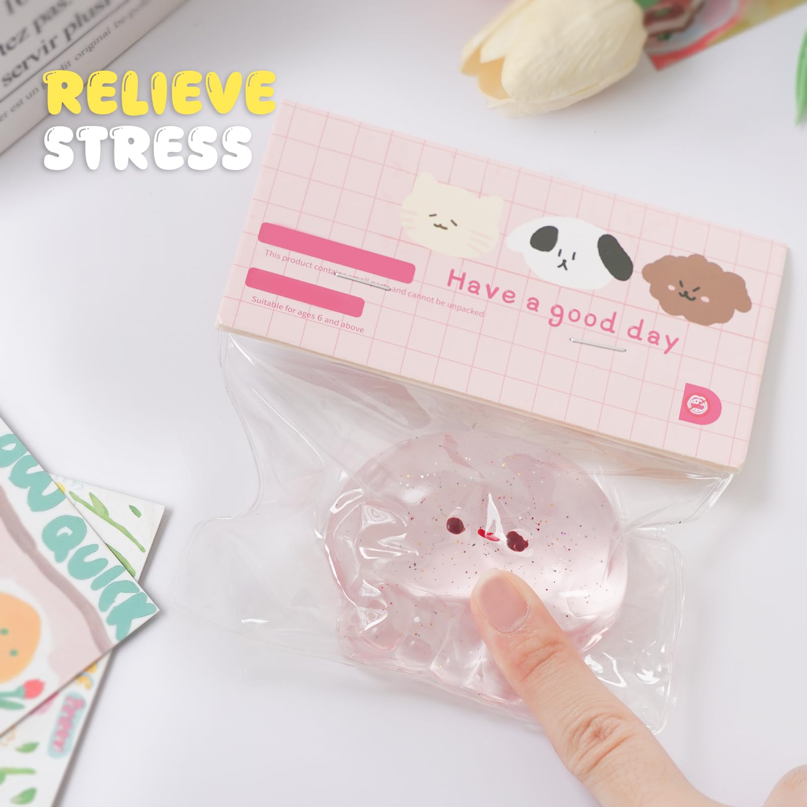 The squishy is cute and soft jelly that fits perfectly in the palm of the hands. It is placed in a transparent bag and the small balls and other small accessories inside are placed manually so the color size and style are random. These stress balls for mature-themed can be easily tucked into pockets backpacks bags etc. as travel toys!