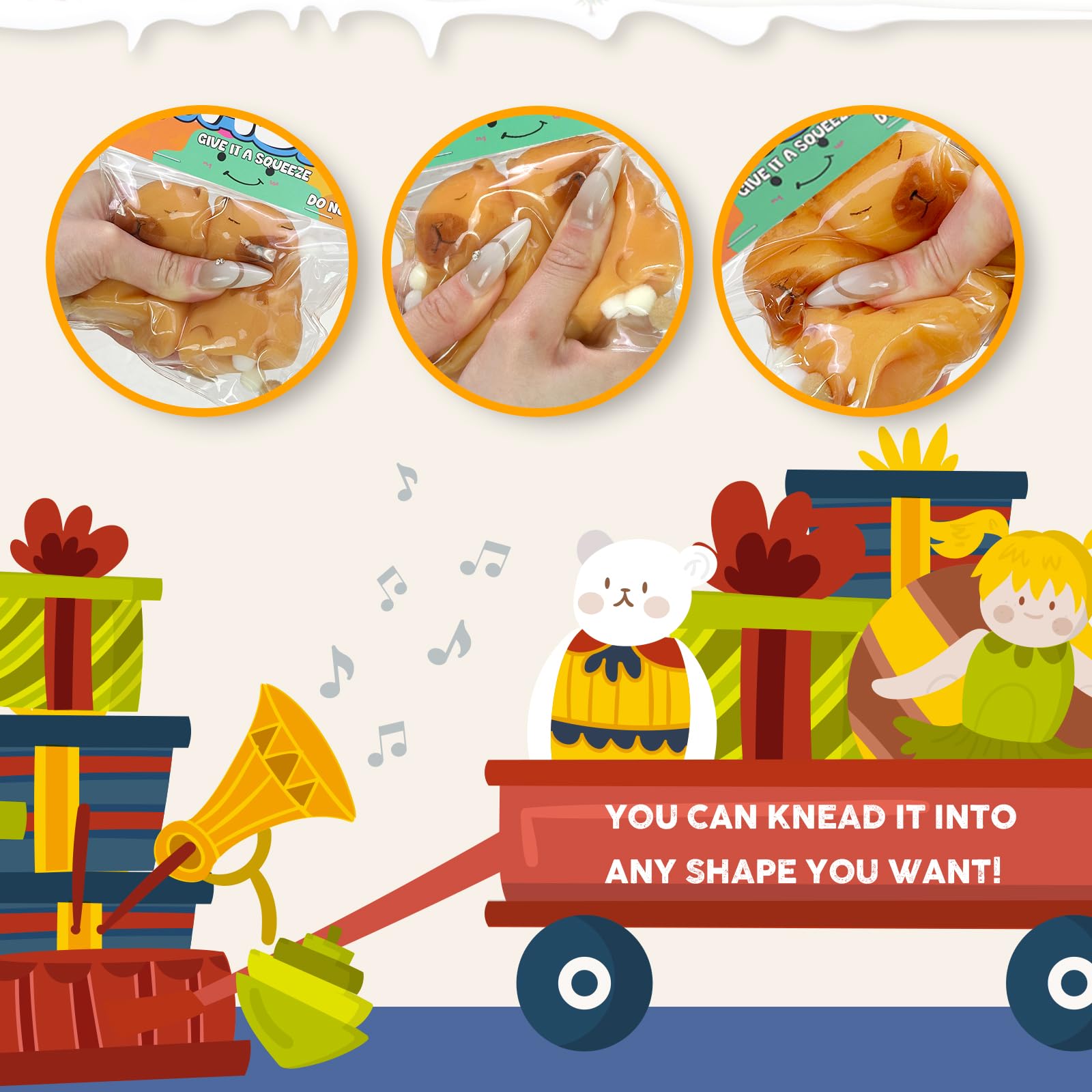 The squishy is cute and soft jelly that fits perfectly in the palm of the hands. It is placed in a transparent bag and the small balls and other small accessories inside are placed manually so the color size and style are random. These stress balls for mature-themed can be easily tucked into pockets backpacks bags etc. as travel toys!