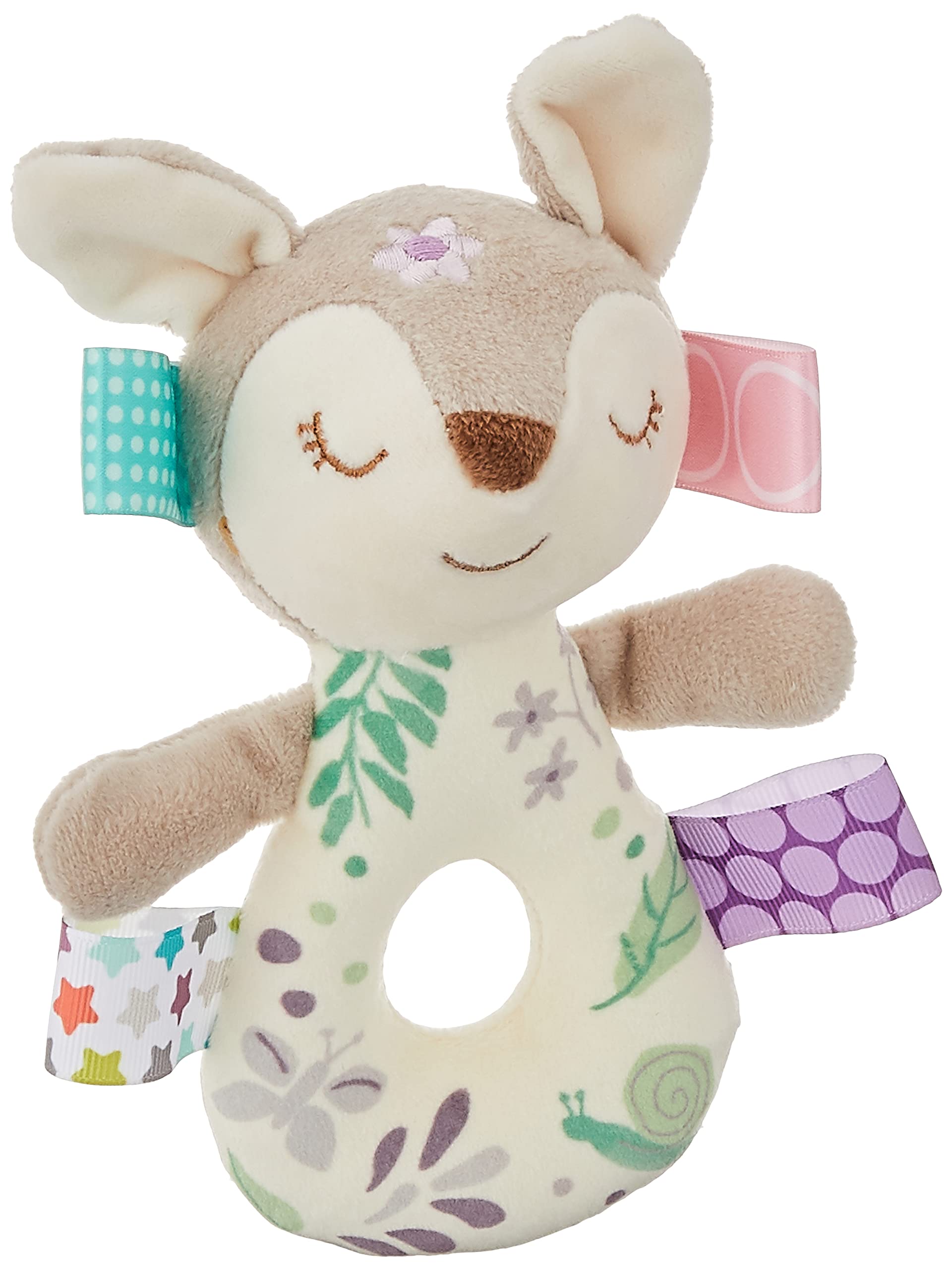 - Q: What features make this rattle engaging for babies? A: The Flora Fawn rattle features interactive satin loop tags that babies love to explore, providing tactile stimulation. Its colorful floral-patterned fabric and embroidered sleepy eyes make it visually appealing, engaging the senses of touch and sight.