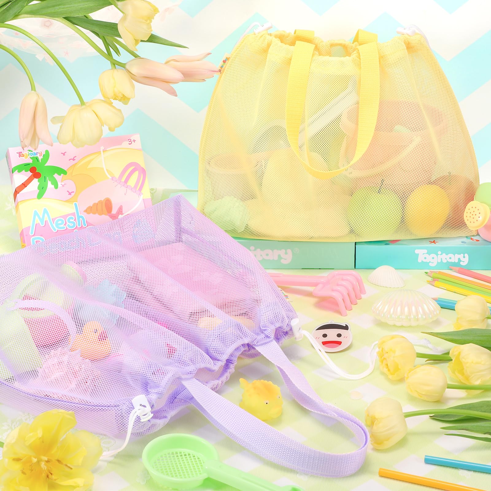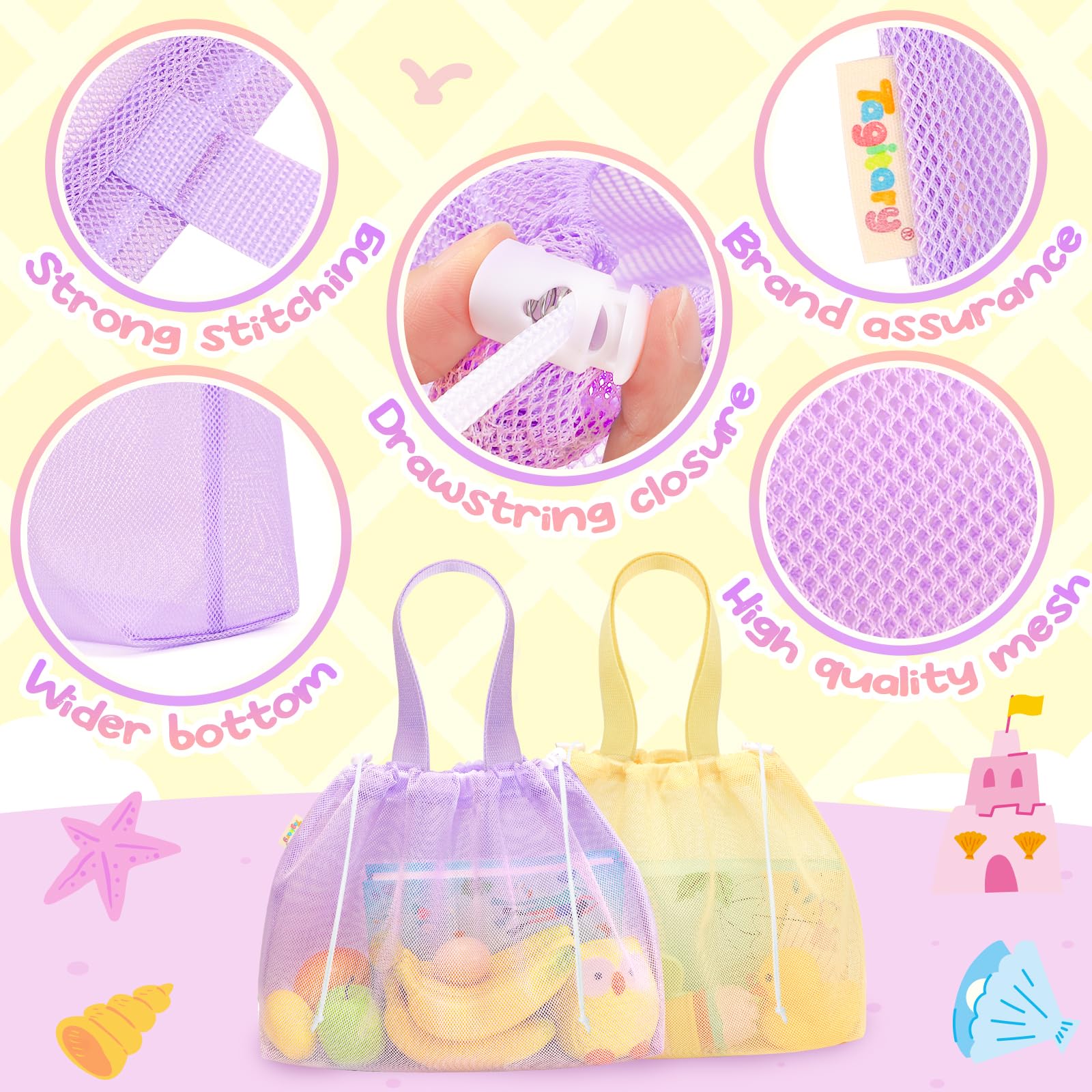 Tagitary Beach Toys Kids Beach Bag Tote with Drawstring,Yellow Purple Mesh Bag Travel Beach Essentials for Kids Swim Pool Gym Ba
