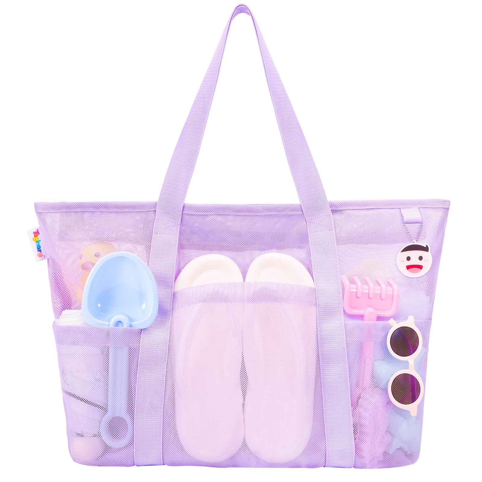 Tagitary Beach Toys Mesh Beach Bag with Zipper and 8 Pockets, Purple Large Beach Tote Waterproof Sandproof for Camping Sports Po