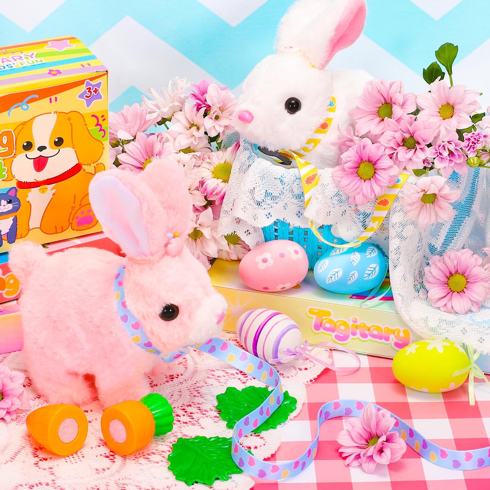 - Q: How does the interactive feature of the bunny work? A: The interactive features of the Tagitary Plush Bunny Toy include realistic movements such as hopping forward, wiggling ears, and a twitching nose. To activate these features, simply insert 2 AA batteries, turn on the switch, and watch the bunny come to life with sounds and movements.