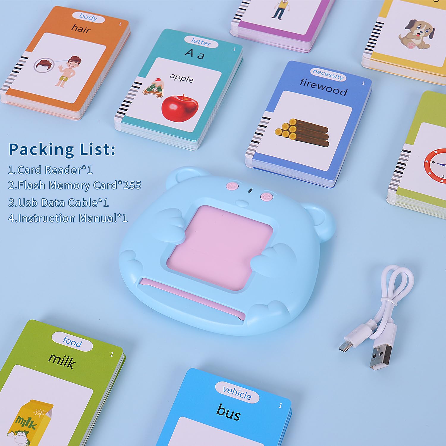 - Q: Is the Talking Flash Cards set rechargeable? A: Yes, the card reader features a built-in rechargeable lithium battery, allowing for easy charging with the included USB data cable. A full charge provides over three hours of continuous use.