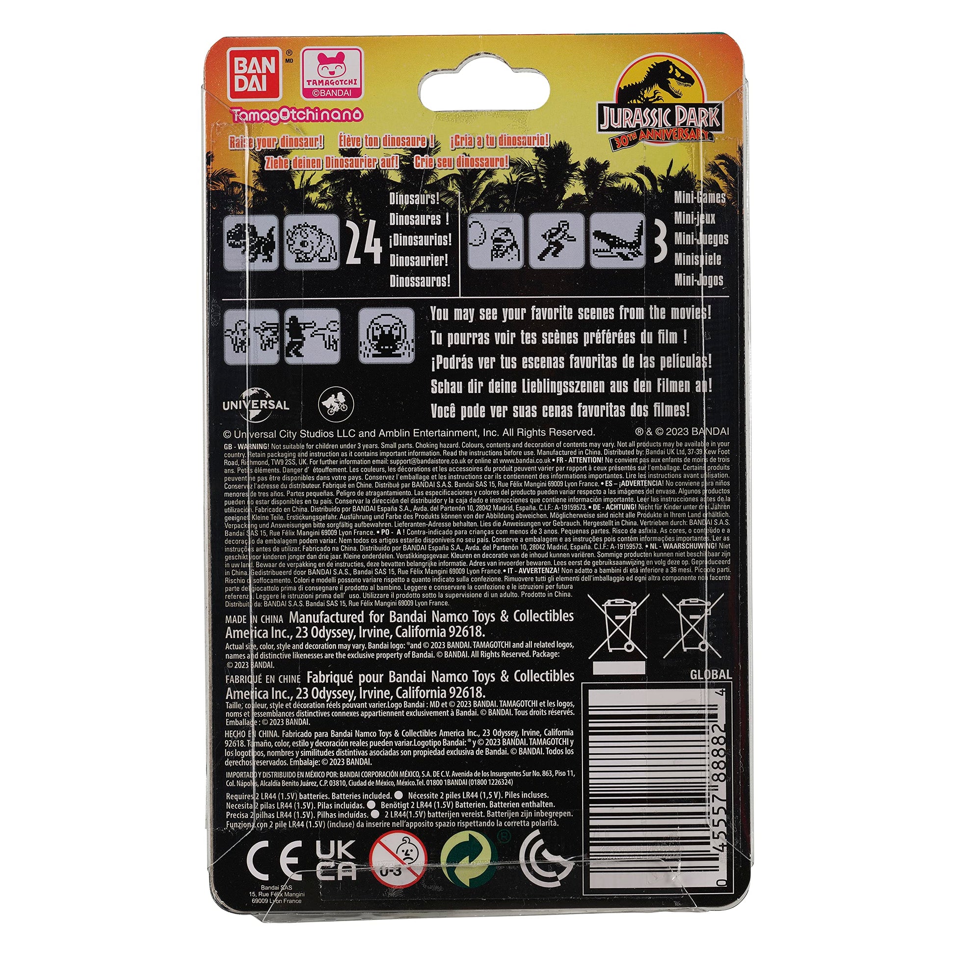 In this collaboration between Jurassic Park 30th Anniversary and Tamagotchi, you can raise dinosaurs! If your dinosaur is hungry, you can feed them leaves and nuts if they are herbivores, or meat and fish if they are carnivores. When they are in a bad mood, give them a snack or play the three mini-games. The three mini-games you can play are called Which One? , Escape , and Catch Food! . Depending on how you take care of your baby-Dino, they may evolve into over 20 different dinosaurs. In addition to nurturing characters, rare dinosaurs may appear! If you dont take proper care of your dinosaur, they will leave you. Batteries (LR44x2) included. For Ages 8+.