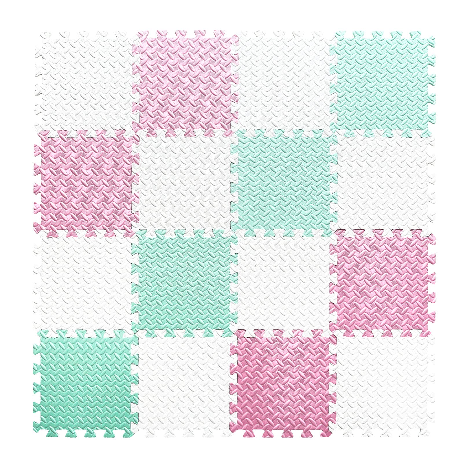 Tamiplay 16 Tiles Foam Play Mat, 0.4 Inch Thicked Interlocking Floor Mats With Solid Colors, Squares Baby Play Mat, Eva Foam Puzzle Floor Mat Foam Mats For Kids, Baby, Toddlers(White/Pink/Bean Green)