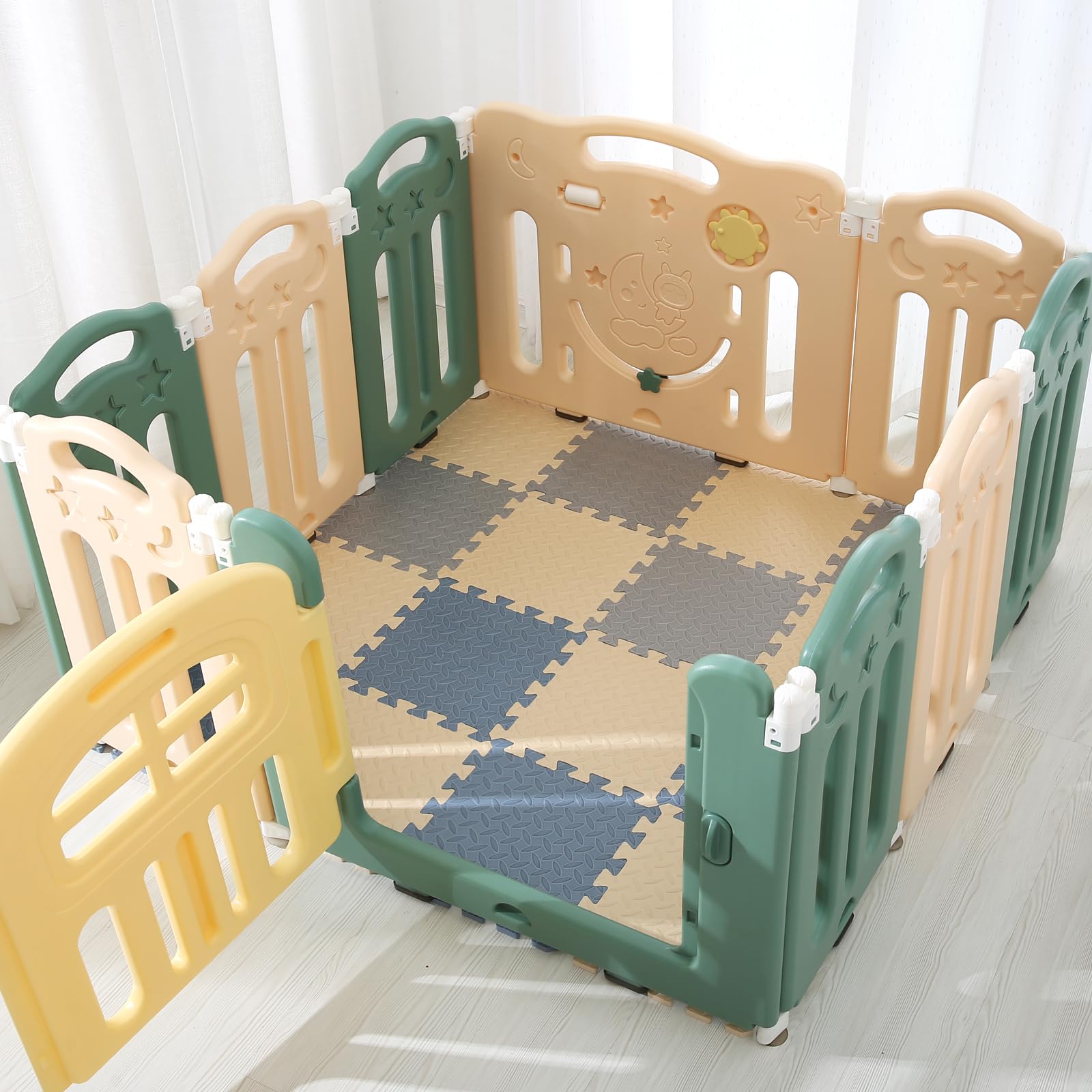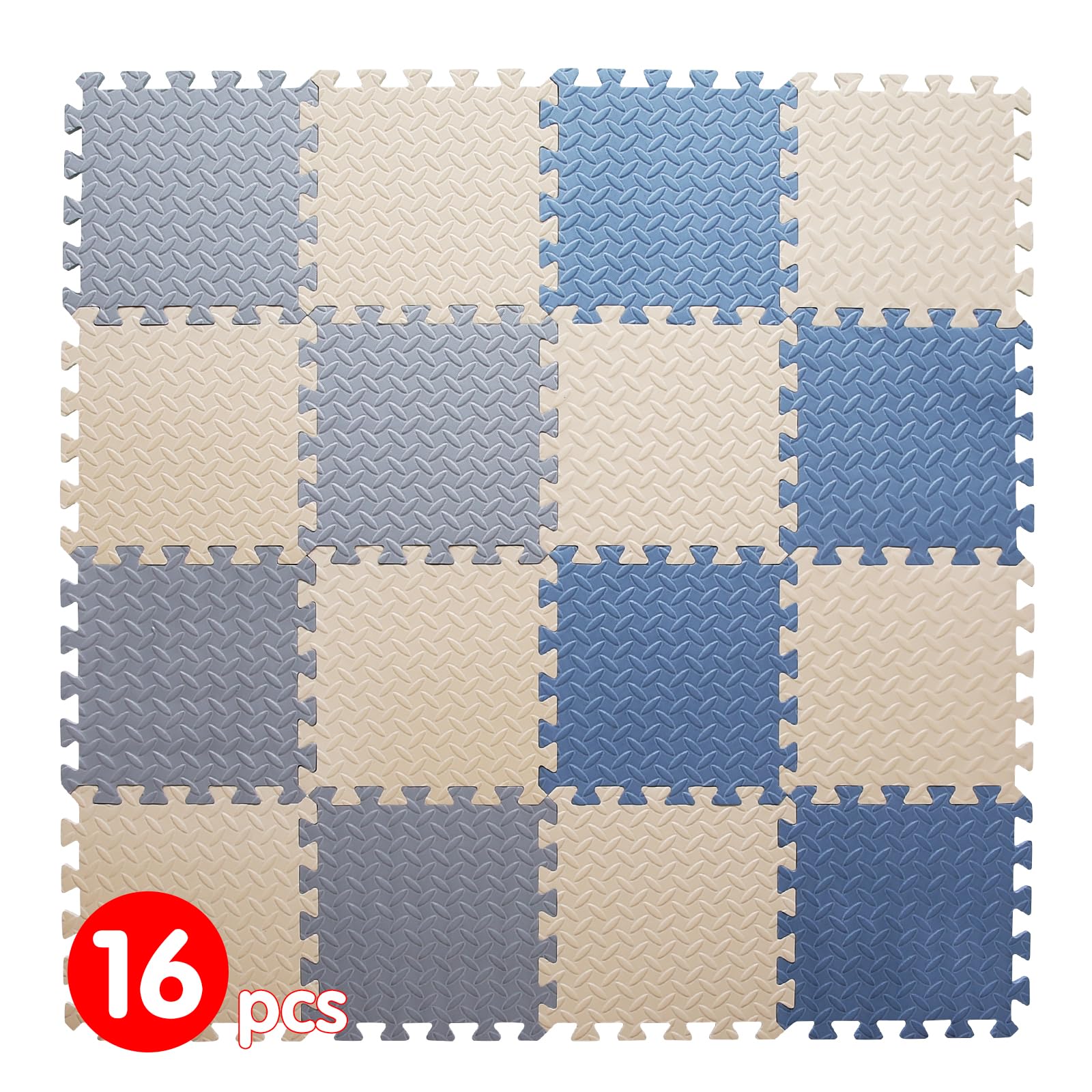 16 Tiles Square Play Mat --- The size of each square tile is 1 sq.ft.(11.81*11.81*0.4 Inch), and the total coverage area is 16 sq.ft. (4' x 4'area) | 0.4 Inch Thicked Foam Play Mat --- Using high-density EVA foam support, 0.4 inch thick baby crawl mat brings good cushioning performance, comfortably cushions spine, hips, knees and elbows on hard floors | Safe material, Anti-Slip, Anti-Bending, Easy Assemble --- The foam play mat is made of safe material, tested free of lead, bpa's and Phthalate; The surface with leaf texture, double-sided non-slip; clean with damp cloth & mild soap; light weight, very easy to assemble | 3 Colors Assembled Randomly --- The foam floor mats comes with 3 colors, which can be randomly spliced, there are a variety of splicing patterns. Helps to improve the child