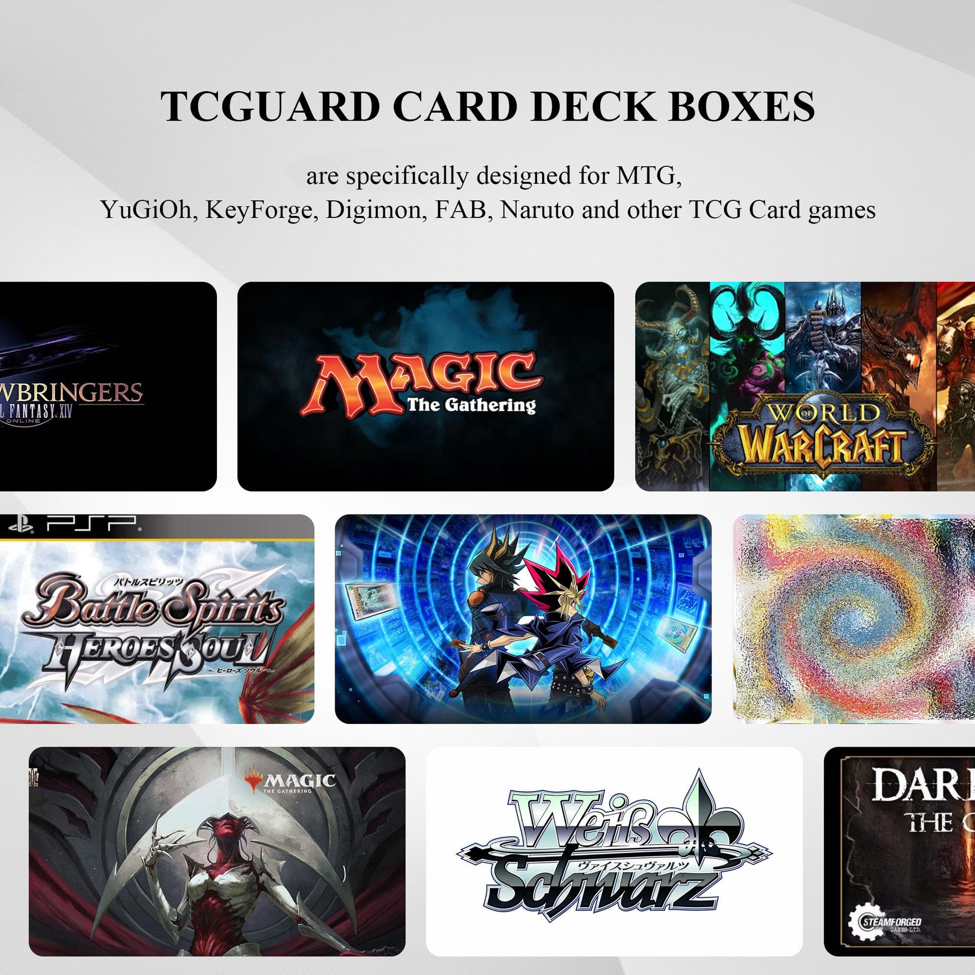 • Q: Is the TCGUARD Card Deck Box suitable for different trading card games? A: Yes, this deck box is compatible with various trading card games such as Magic: The Gathering (MTG), Yu-Gi-Oh, HeroQuest, and Pandemic, providing a versatile storage option for your card collection.