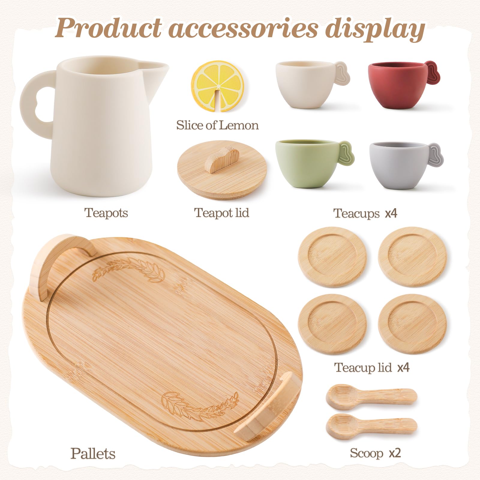 - Q: What accessories are included in the Tea Party Set? A: The Tea Party Set comes with 4 teacups, 2 spoons, 4 small wooden trays, 1 large tray, and 1 lemon slice, providing everything needed for a delightful pretend tea party.