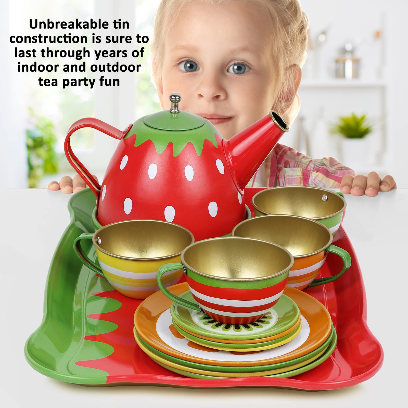 Tea Set for Little Girls, Pretend Play Tea Party Set, Fruit Design Kids Tin Tea Set with Carrying Case (15 Pcs)