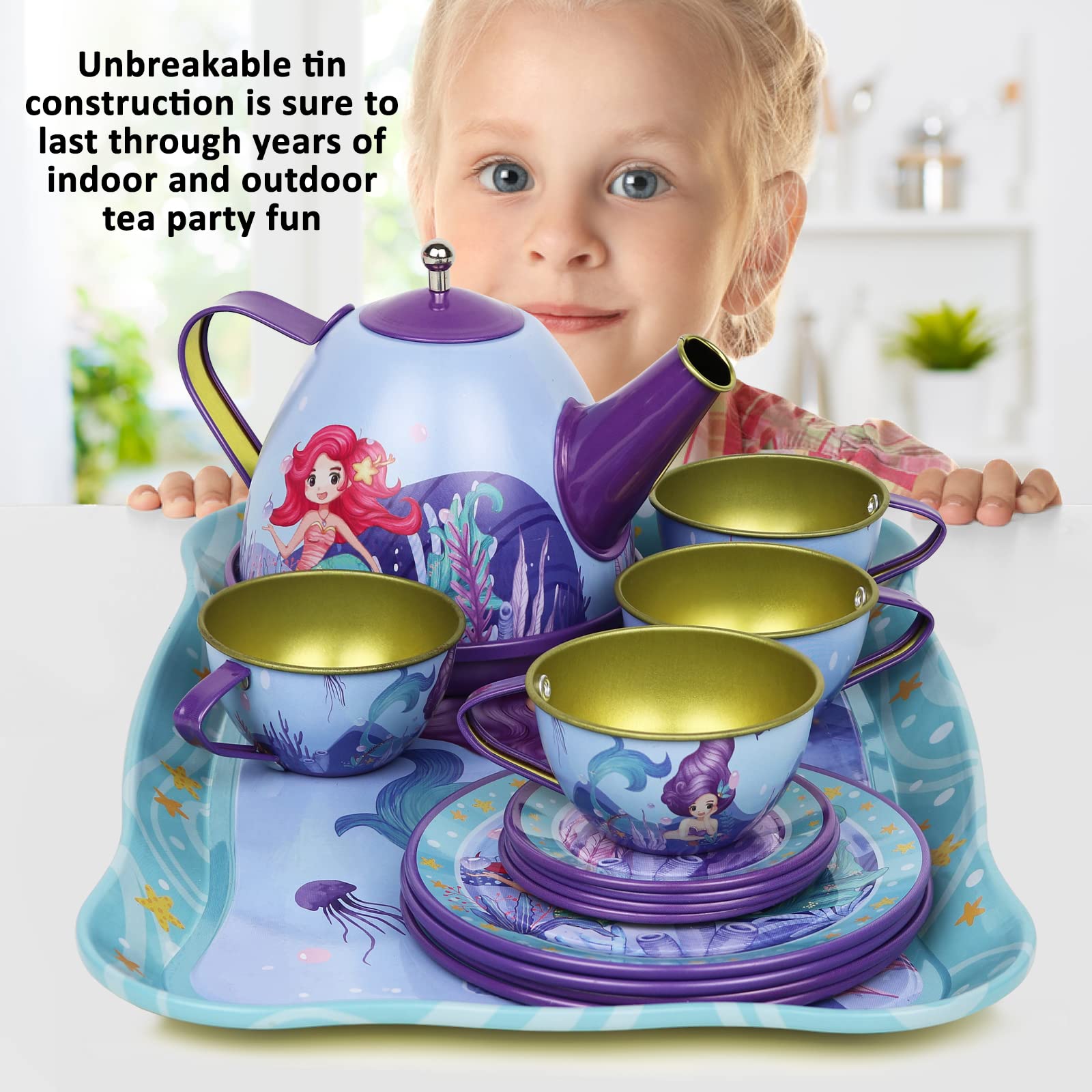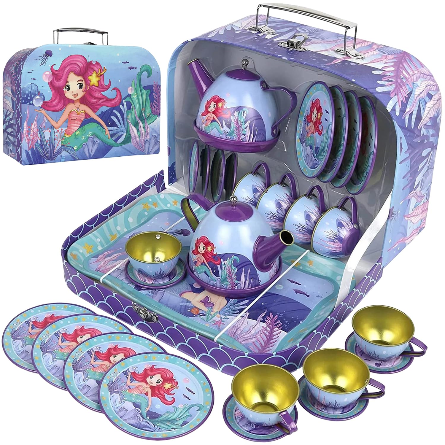 Tea Set For Little Girls Pretend Play Tin Tea Party Set Mermaid For Kids With Carrying Case (15 Pcs)
