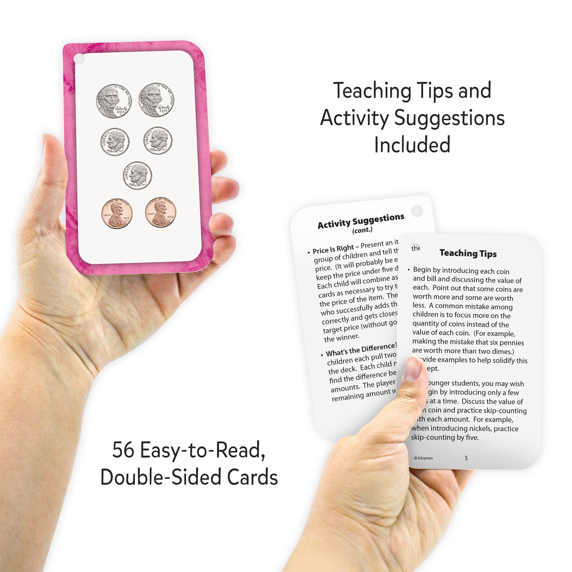 - Q: What types of activities can be done with these flash cards? A: The flash cards come with teaching tips and suggested activities that encourage interactive learning. You can use them for games, quizzes, and hands-on exercises to reinforce money recognition and counting skills.
