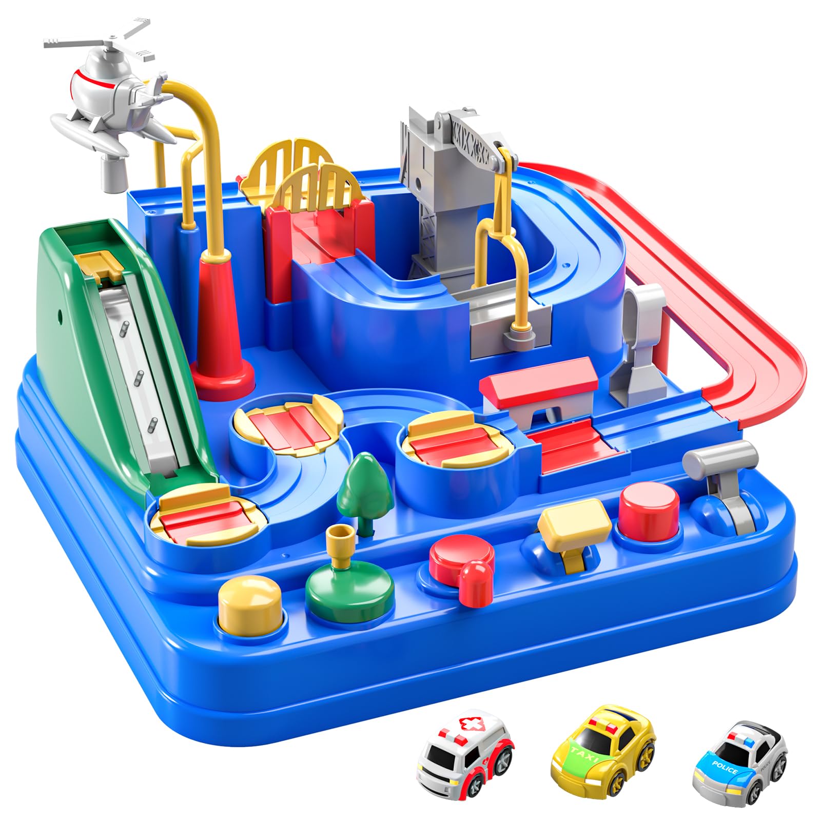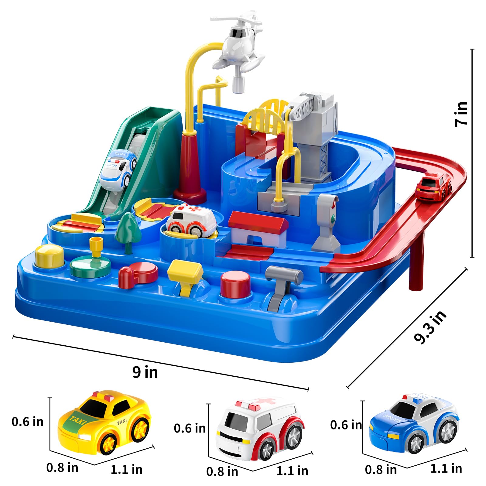 This car adventurous toy (9in *9.3in *7in)has the nice design, with 6 buttons and 8 different challenges, 3 small cars(1.1in*0.8in*0.6in): police car, ambulance, red fire truck(or yellow taxi). It helps to train and improve children's motor skills and hand-eye coordination by guiding children through every obstacle and challenge.