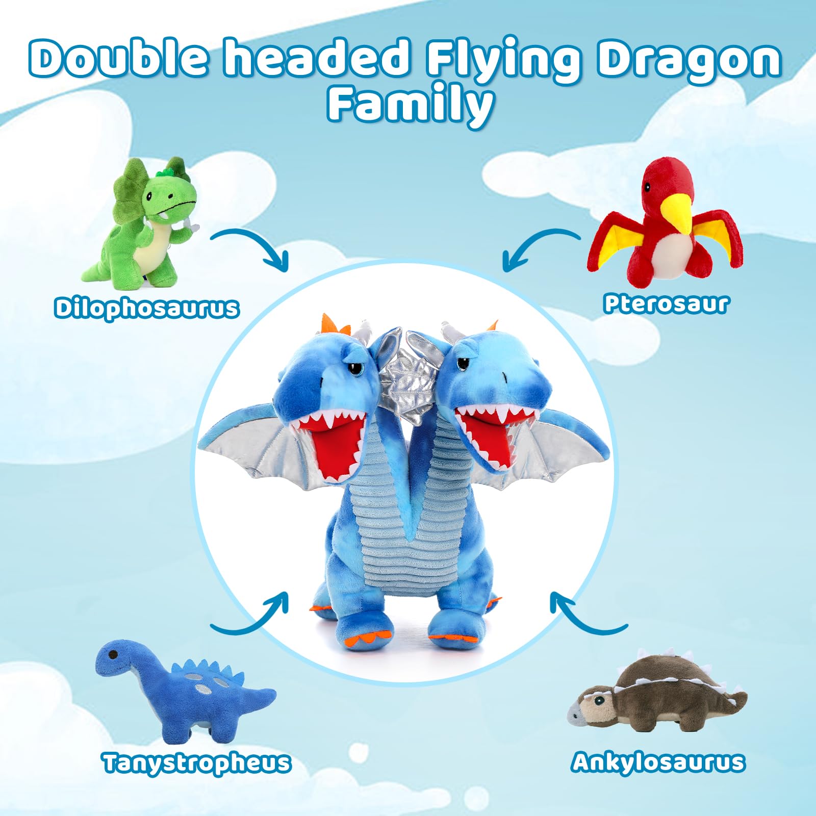 Tezituor Double Headed Dragon Stuffed Animals, 5 PCs Stuffed Dinosaur Plush Toys Set, Mommy Dragon with 4 Baby Dinosaurs Plushie