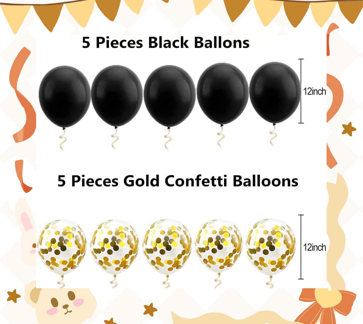 - Q: Are the balloons included in the set safe for indoor use? A: Yes, the set includes 10 balloons (5 black and 5 golden confetti balloons), each measuring approximately 12 inches. They are safe for indoor use, and it is recommended to inflate them to 80% capacity to avoid over-inflation.