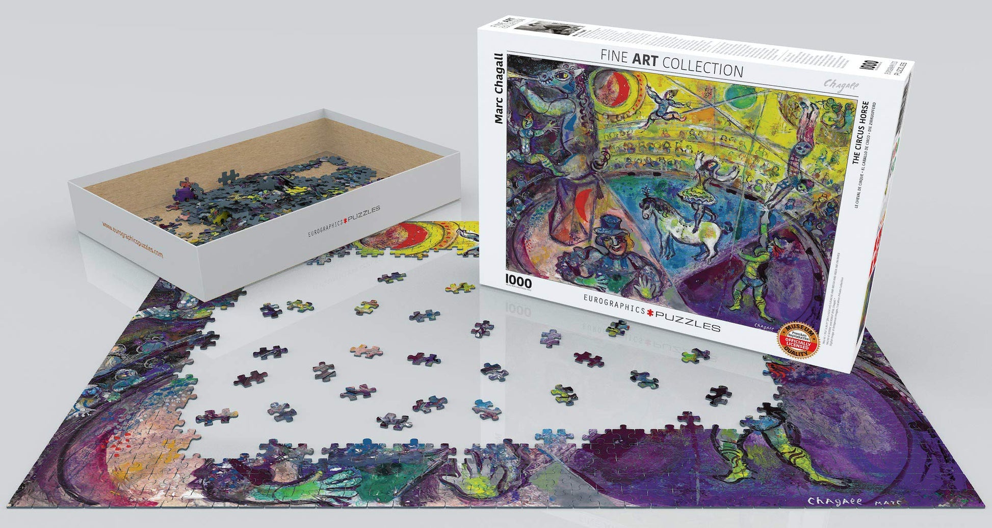 EuroGraphics The Circus Horse by Marc Chagall 1000-Piece Puzzle. Box size: 10' x 14' x 2.37'. Finished Puzzle Size: 19.25' x 26.5'. Chagall truly captures the bright, vibrant colors and the hectic atmosphere that characterized the early Russian circus. Strong high-quality puzzle pieces. Made from recycled board and printed with vegetable based ink. This superior quality puzzle will delight and educate all at the same time.