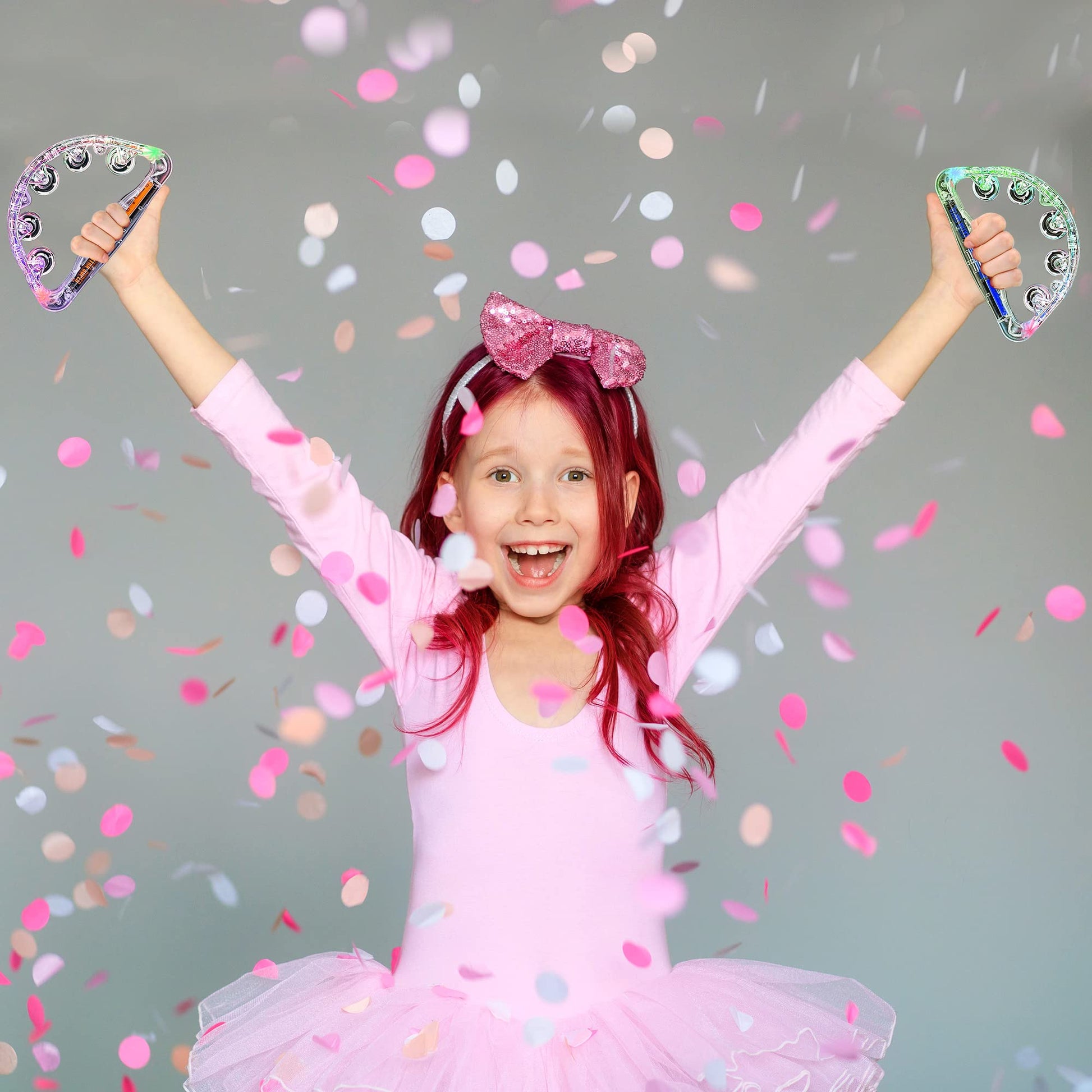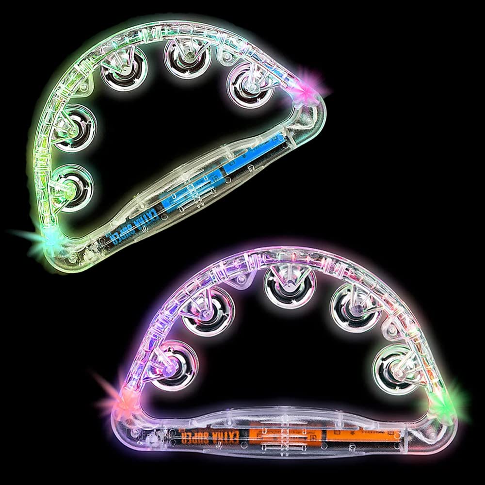 Flashing Tambourines Hand Held, 9'' Inch Tambourine Flashes in Assorted Colors, Ring Metal Jingles Percussion Musical Educational Hand Instrument, Party Kids Games (2-Pack). Flashing Tambourines: These Flashing Handheld Tambourines come to bring life to every party! Great as noisemakers for every occasion. Flashing: Light flashes in various colored patterns. Pull the tab to illuminate, Great for parties and celebrations. 3xAA batteries included. Party Favor: The Tambourines will add Fun and Atmosphere to your party that will leave good memories to all your guests! They are wonderful gifts for Birthday Parties, Carnival Prizes, Classroom Rewards, Goodie bag Fillers, Halloween Costumes, and much more. Size & Colors: The Tambourines are 9 and flash in various colored patterns