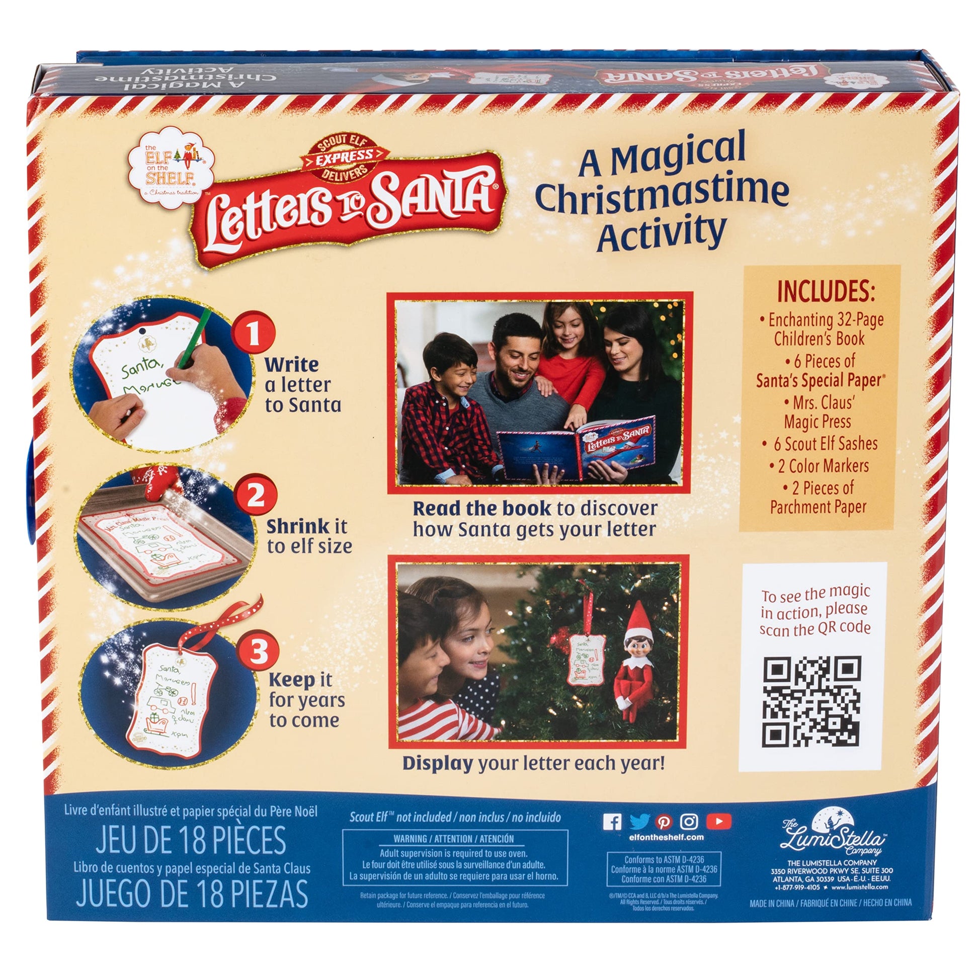 Product DescriptionWith the help of this Elf on the shelf kit, your kids can quickly get their letters to Santa straight to the North Pole! Mrs Claus Magic Press and Santas Special Paper shrink letters to elf-size so they can easily be carried by your elf. After Santa reads a letter, your Scout Elf will hang it on your Christmas tree as a keepsake ornament.Set Contains:1 x Illustrated Book; 8 x Santas Special Paper; 1 x Mrs Claus Magic Press, 8 x ribbon saches;2 x markers; 2 x sheets of parchment paper