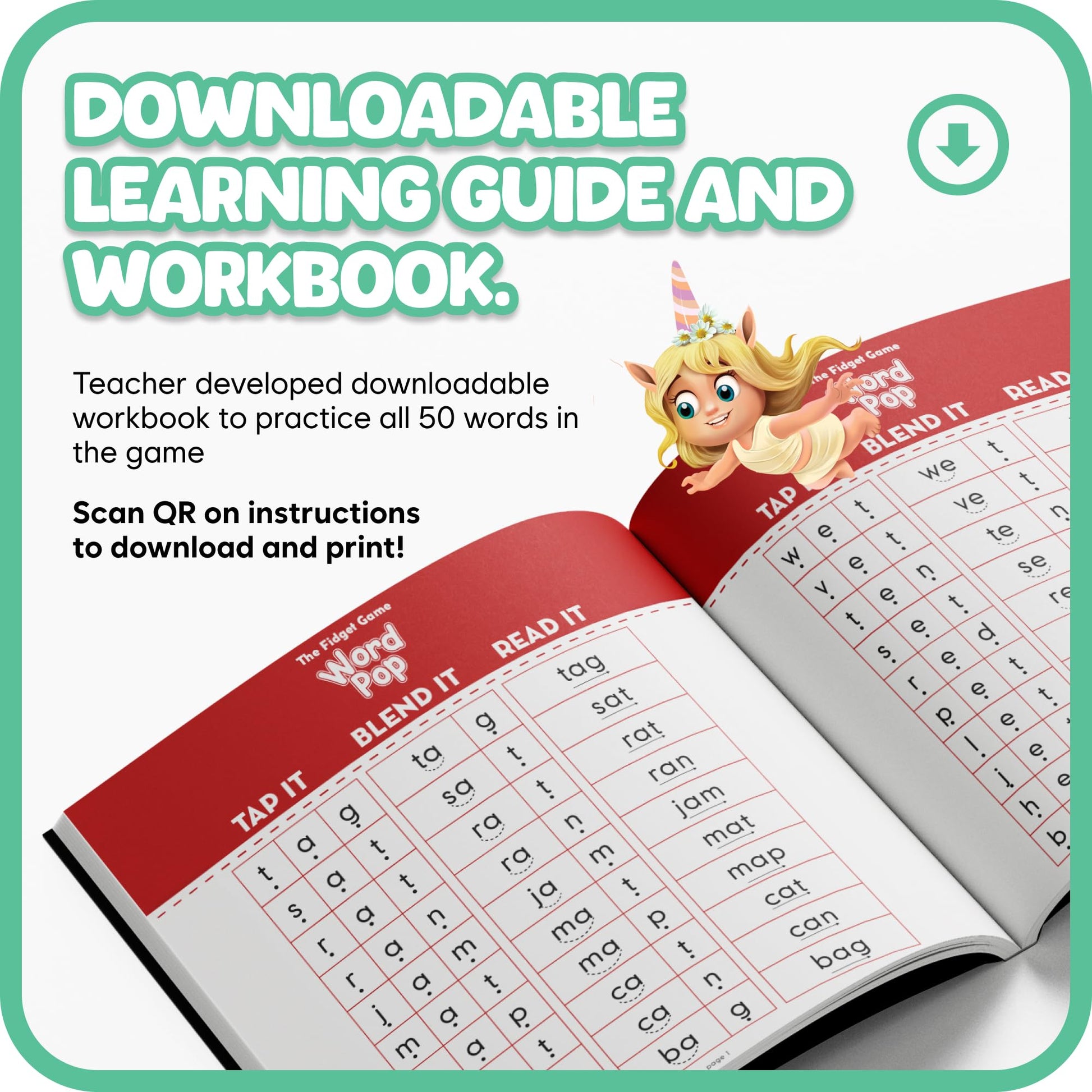Word Pop by The Fidget Game: The Science-backed Multisensory Learning Experience for KidsFrom kindergarten teachers to busy parents: playing Word Pop gives your children an unforgettably engaging, fun, and rewarding learning experience! A combination of sight, sound, and touch immerse children into a multisensory learning environment (why not include some brain-boosting snacks on the side, too!) Simply flip a card, search for the word on the fidget, sound out the word, and pop the letters on the fidget! Research shows playing games while learning helps retain knowledge and understanding in children by 25%, so get ready to hear your child using new CVC words daily after enjoying every minute of this interactive game! Find Out Why is the Easiest Way to Teach Letter Sound Blending: ? Game-Based Learning: We combine the best parts of spelling games and phonemic awareness games to supercharge your kid's learning. ? Developed by Science: The engagement of multiple senses leads to greater memory retention, higher recall accuracy, and memory retrieval. ? Simple Instructions: Begin to play this CVC learning game in minutes! ? No Screens: Reading in print significantly increases the learning process compared to screen learning. ? Perfect for Different Settings: Enjoy this super enjoyable game in the classroom, nursery, kindergarten, and more!The Perfect Start for Your Young ReadersGather 2- 4 players and hand out the CVC poppers to begin a multisensory immersion game that will give children from pre-kindergarten age to 1st grade the confidence to transform simple sounds into whole words. We recommend investing in The Fidget Game Word Pop and Sight Words game for the most effective and fun learning experience!