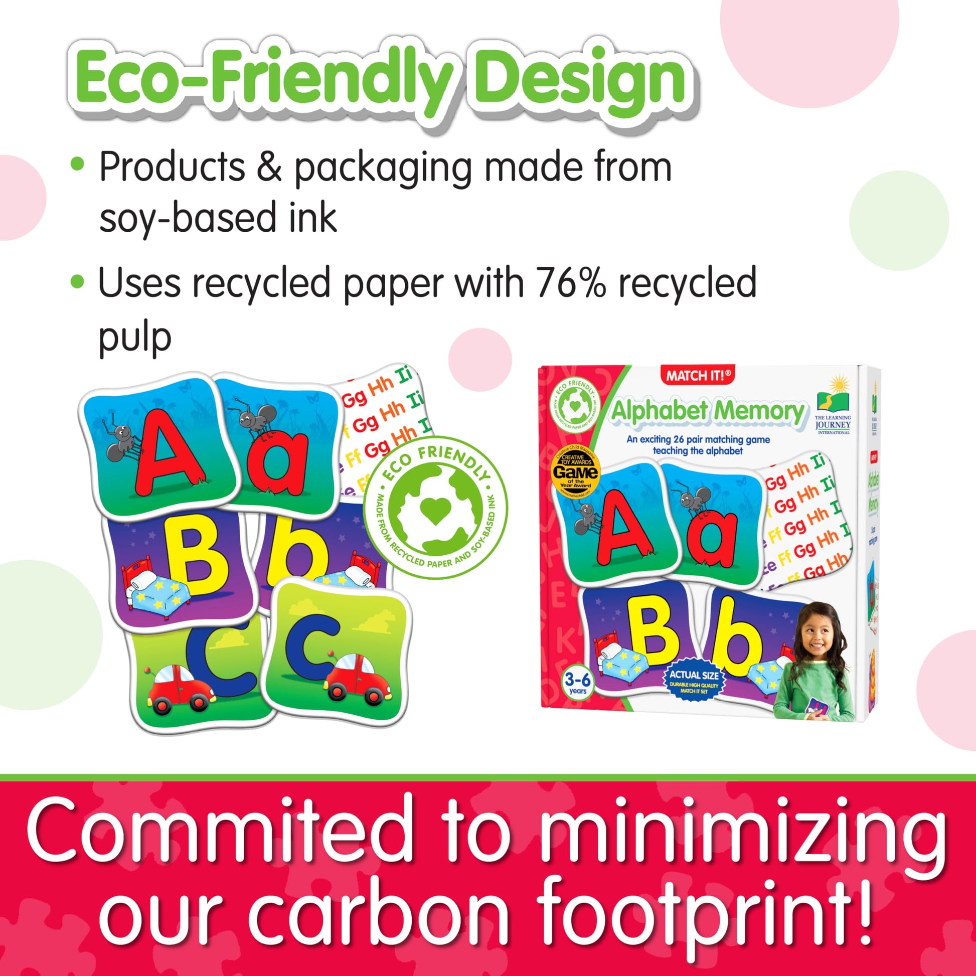 Product DescriptionThis fun alphabet themed memory game will challenge problem solving and develop memory skills of young children as they try to find a pair of matching letter cards. Bright, colorful illustrations teach the upper and lower case letters of the alphabet. A great family game for all ages.From the ManufacturerThe Match It Memory series is a fun game series that will challenge problem solving and develop memory skills of young children as they try to find a pair of matching cards. Bright colorful illustrations will introduce a variety of themes including alphabet, mathematics, counting, first words and spelling and also encourage discussions between parent and child. Match It Memory games are great family games for all ages. This alphabet-themed game of memory includes 26 double-sided matching pairs. Ages 3 + years.