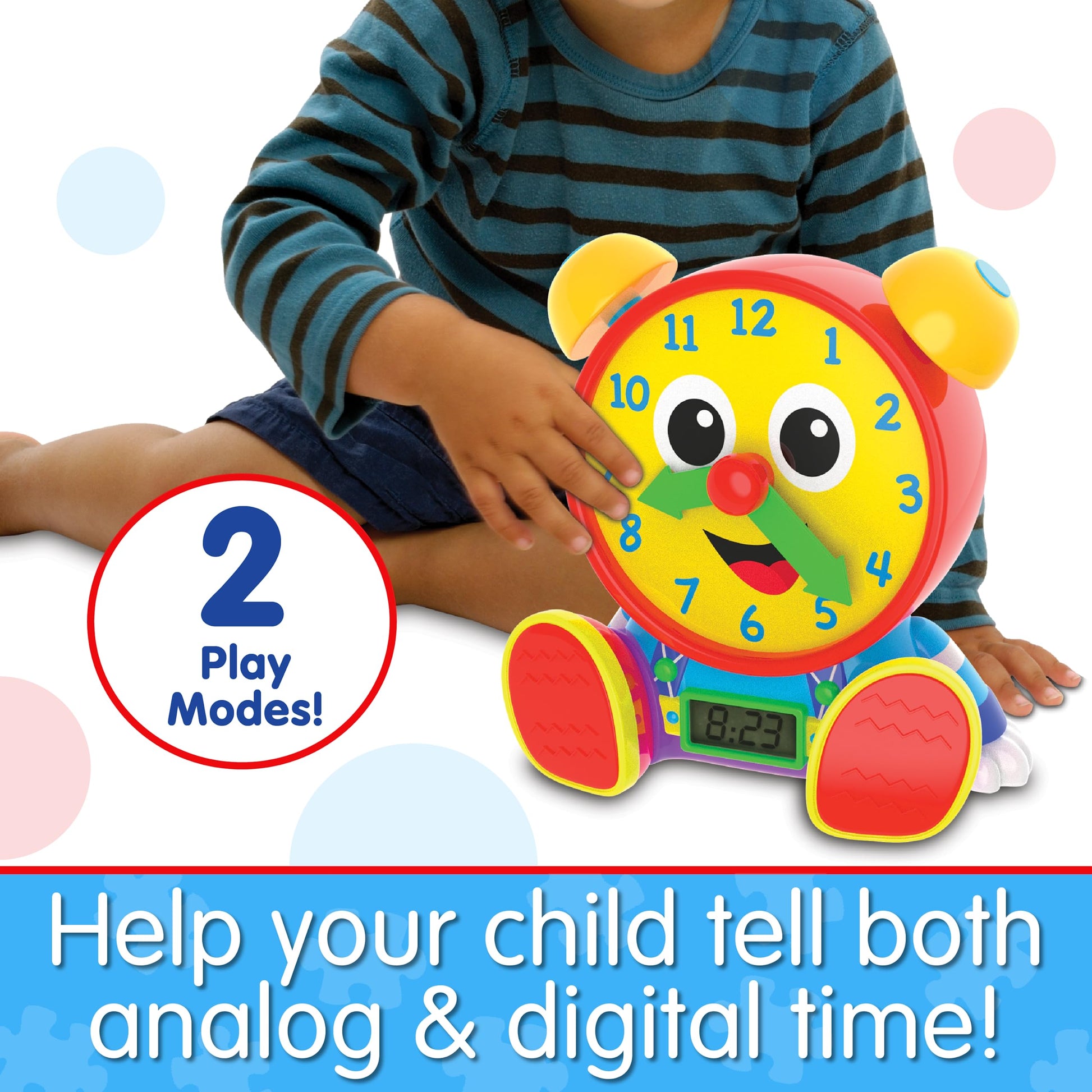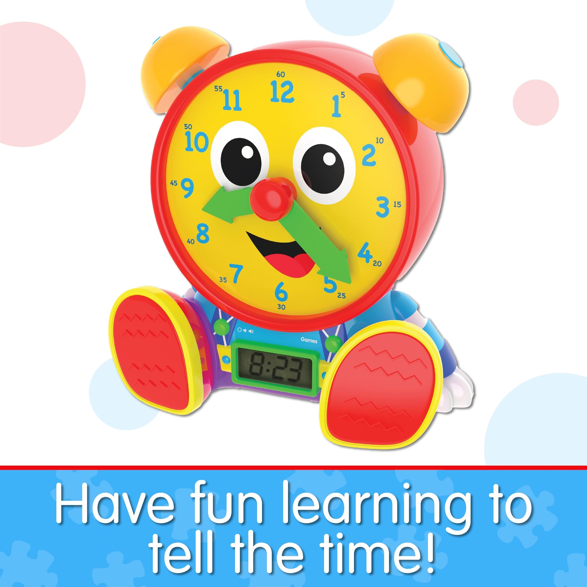 - Q: What age is the Telly Jr. Teaching Time Clock suitable for? A: The Telly Jr. Teaching Time Clock is designed for children ages 3 years and up, making it an ideal educational toy for toddlers and preschoolers.