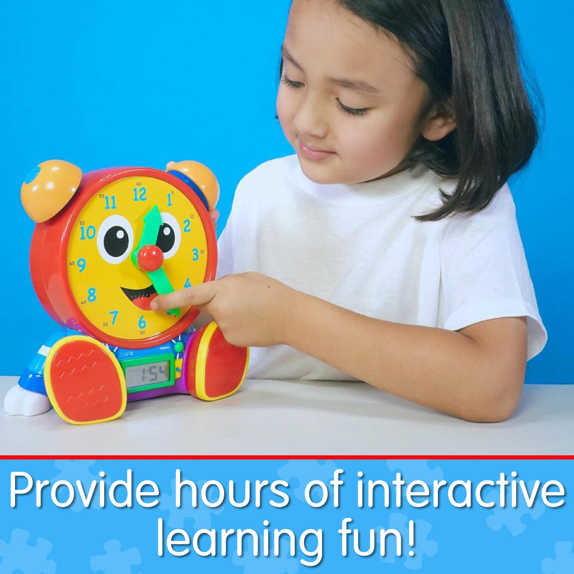 - Q: What are the educational benefits of using the Telly Jr. Teaching Time Clock? A: This teaching clock promotes listening, visual, tactile, and motor skills while encouraging critical thinking and learning in young children.