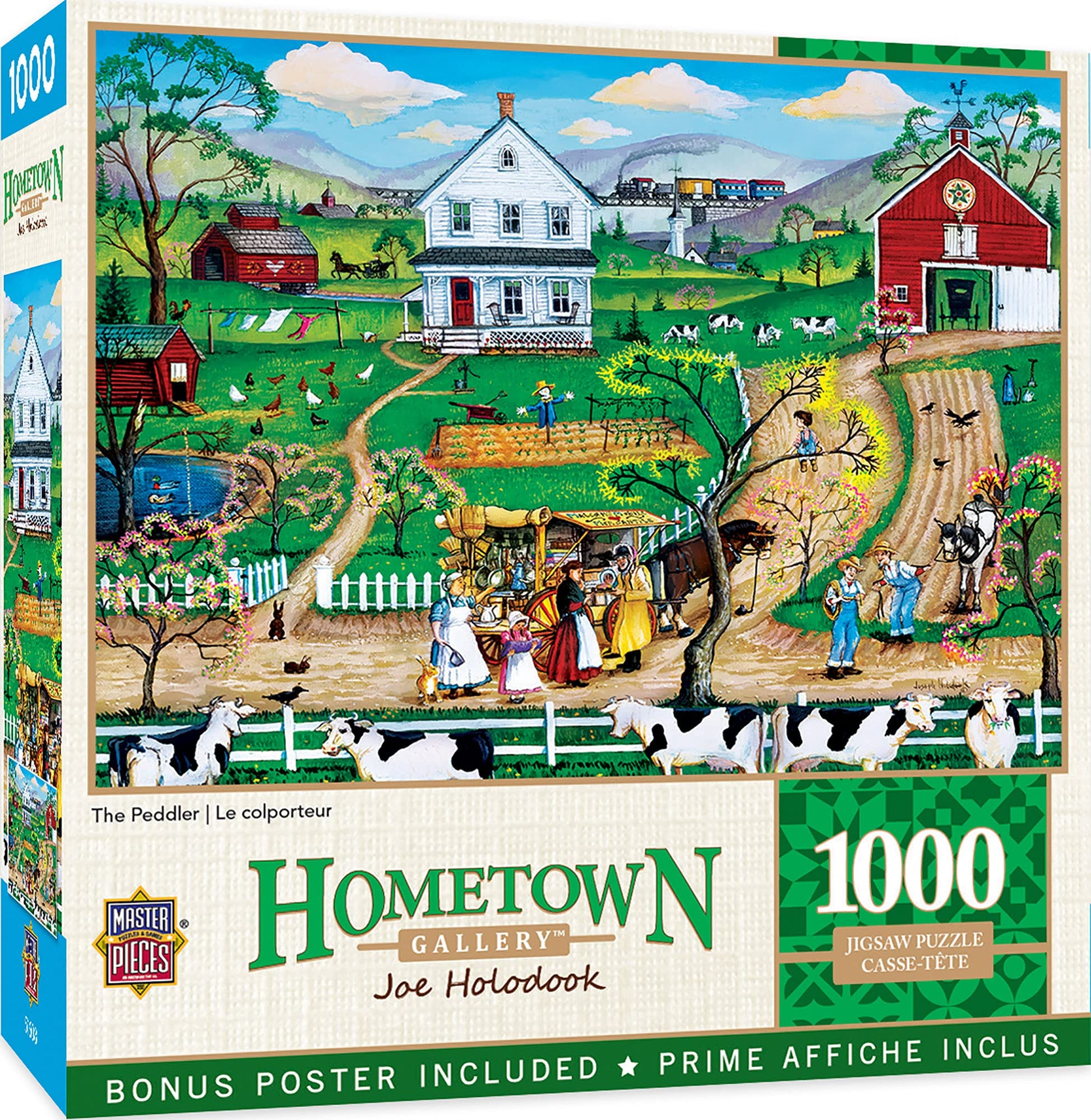 These MasterPieces 19.25'' x 26.75'' 1000pc Hometown Gallery Puzzles are painted by the talented folk artist, Jow Holodook, and they feature beautiful, vintage scenes that remind us all of simpler times. The roaming Peddler comes by with his wagon of wares. To reduce their impact on our environment, the chipboard used in these puzzles is made of recycled material.