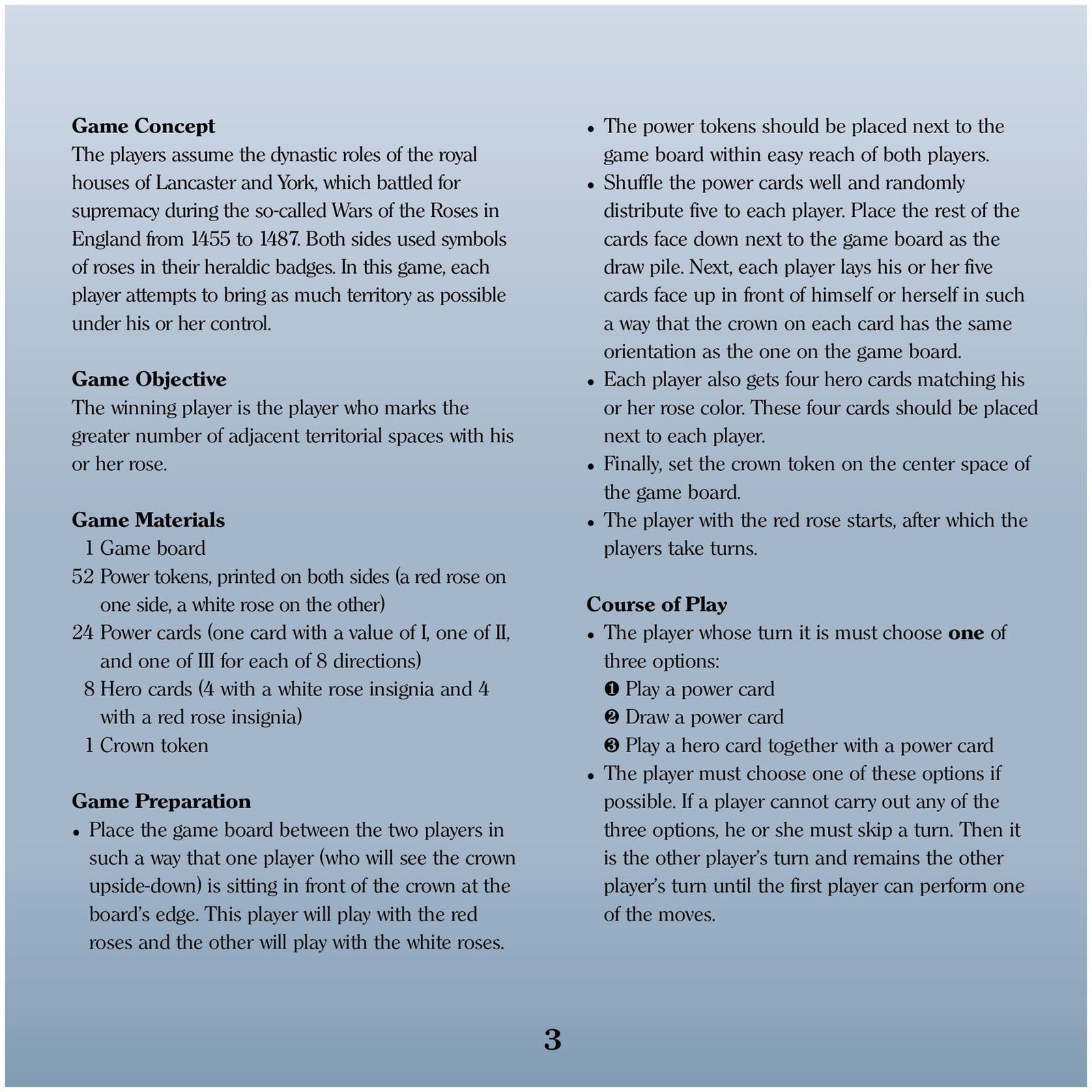 England, 15th century - on one side, The house of York, with its Heraldic badge featuring a single, snow white rose. And on the other side, The house of Lancaster, its own Heraldic rose depicted in blood Red. The war of The roses, a Dynastic struggle for control of the English crown, has erupted between the two houses. In this strategic game, one player commands the house of York and the other, The house of Lancaster. The players use their power cards to bring territories under their control, aiming to keep their territories as contiguous as possible. They also deploy their heroic Knights to take over enemy territories and cause surprising upsets. Who will be crowned Englands new King?.