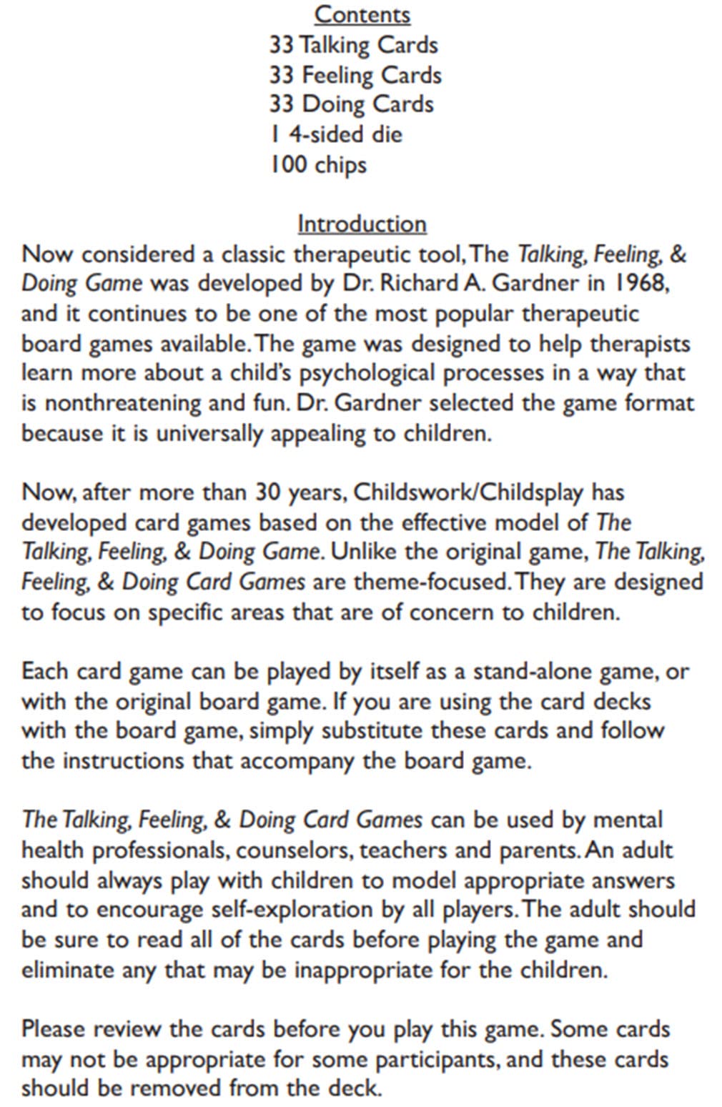 - Q: Can The Talking, Feeling, & Doing Anger Card Game be used with the original board game? A: Yes, this card game can be used alongside the original board game, enhancing the overall therapeutic experience.