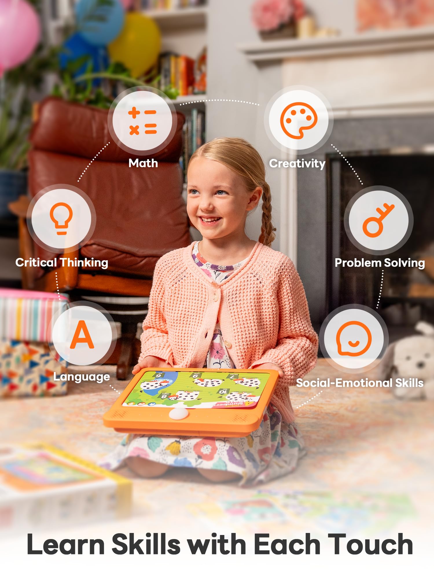 - Q: What types of skills can my child develop using this educational tablet? A: This educational tablet nurtures essential skills such as creativity, imagination, curiosity, concentration, logical thinking, and hand-eye coordination through interactive and engaging activities.