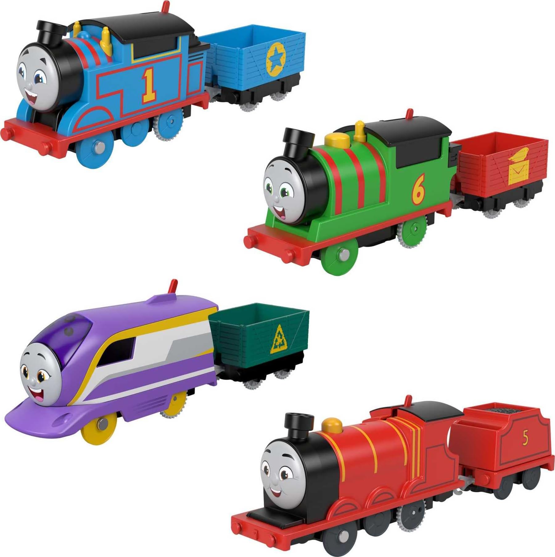 Preschoolers can pack their railway with their favorite characters from the Thomas & Friends show with this set of 4 motorized train engines from Fisher-Price. With popular characters including Thomas, Percy, Kana, and James, young conductors can bring all these railway friends along adventures across Sodor! These battery-powered train engines are compatible with other Thomas & Friends track, except wood. (Additional track sets sold separately and subject to availability.)