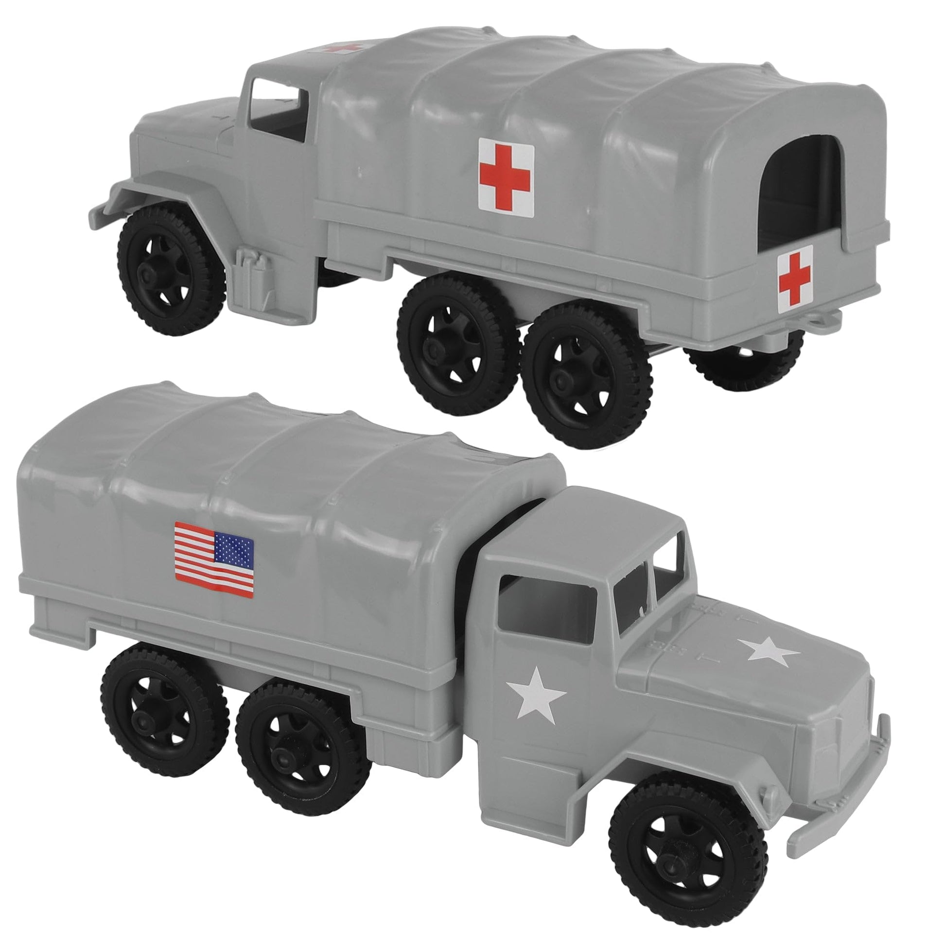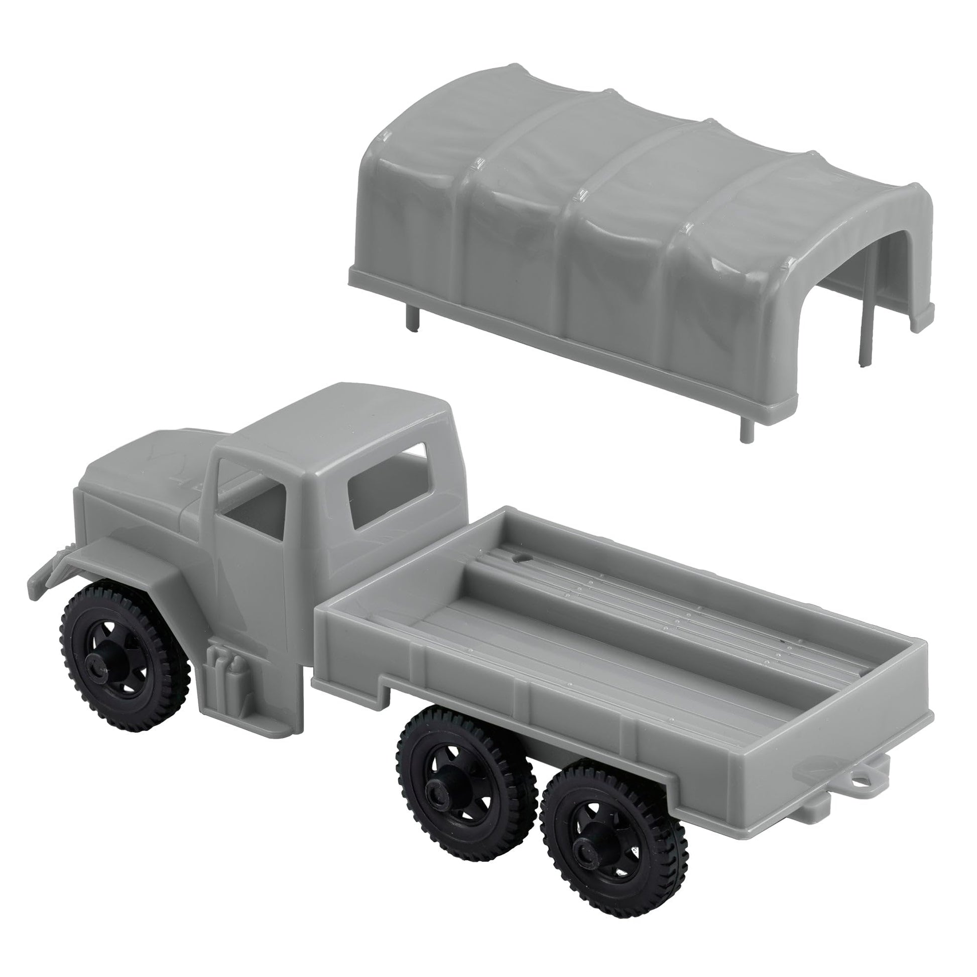 An American classic rides again. These Tim Mee Deuce-and-a-Half 2-1/2 Ton CARGO TRUCKS are proudly manufactugray in the United States and available as this 2 piece set that includes 2 Gray vehicles. Trucks feature removable canvas cover and rolling wheels with real metal axles. Each truck is approximately 1:35 scale and measures 8 inches long. Made from slightly stiff HDPE plastic with medium detail and very little flashing.This is likely the most iconic and popular Army Men Truck of all time and was originally produced from 1964 through 1990 by Processed Plastic (Tim Mee's Parent Company). Modeled after the M34 or M35 built by REO, it is THE most requested Tim Mee item since the Tim Mee M16 Soldiers were reissued back in 2011. The location of the original mold is not known, so a reproduction mold was made to bring this classic toy back to life. The only change to the design is the rear hitch has been updated to match the current Tim Mee Combat Patrol Artillery for compatibility. Includes sticker sheet with military and medical marking options.These are real American made toys, meant to be rolled around, knocked over, picked up and played with for years to come. Recommended for ages 5 and up.