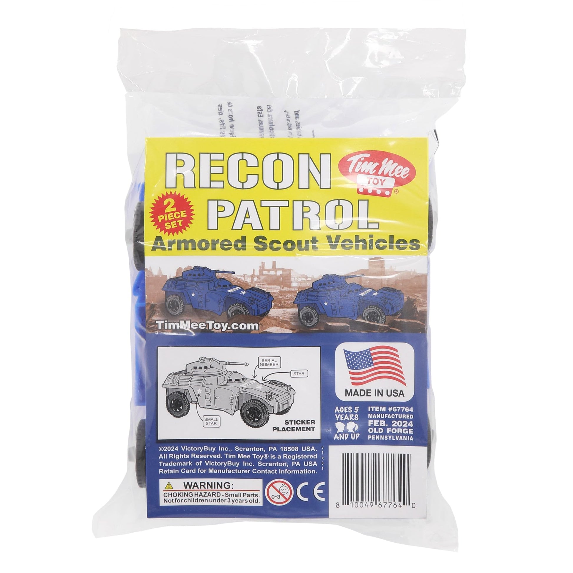 The Tim Mee Toy Recon Patrol is ready to ride again. These Tim Mee Toy #7190 Military Armored Reconnaissance Scout Vehicles are proudly manufactured in the United States. This 2 piece set of Modern Armored Cars feature turrets that rotate and smooth rolling metal axles. Each car measure 6.25 inches long and approximately 1:32 scale. Made from slightly stiff Blue color HDPE plastic with medium detail and very little flashing.First produced by Processed Plastic Co. (Tim Mee Toy's parent company at the time) in 1984 and modeled after the experimental Lockheed XM800W. This 2023 version has been modified so the hitch is now compatible with the current Tim Mee Toy Combat Patrol M3 Artillery for maximum play value.This is real American made toy, meant to be rolled around, knocked over, picked up and played with for years to come. Packed in polybag with insert card and includes optional sticker sheet to customize your vehicles. Recommended for ages 5 and up.
