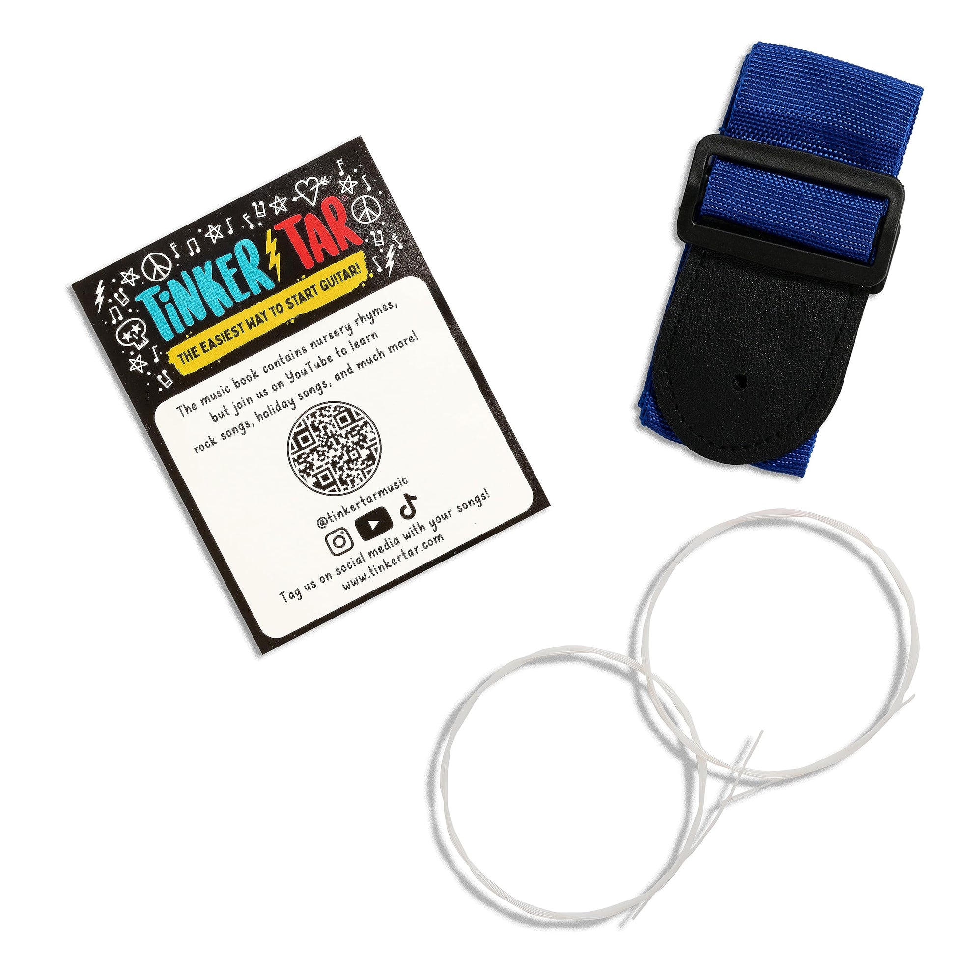 - Q: What accessories are included with the TinkerTar guitar? A: The TinkerTar package includes a 1-string guitar, a guitar strap for easy play, two replacement guitar strings, and an instructional music book featuring 12 kid-friendly songs.