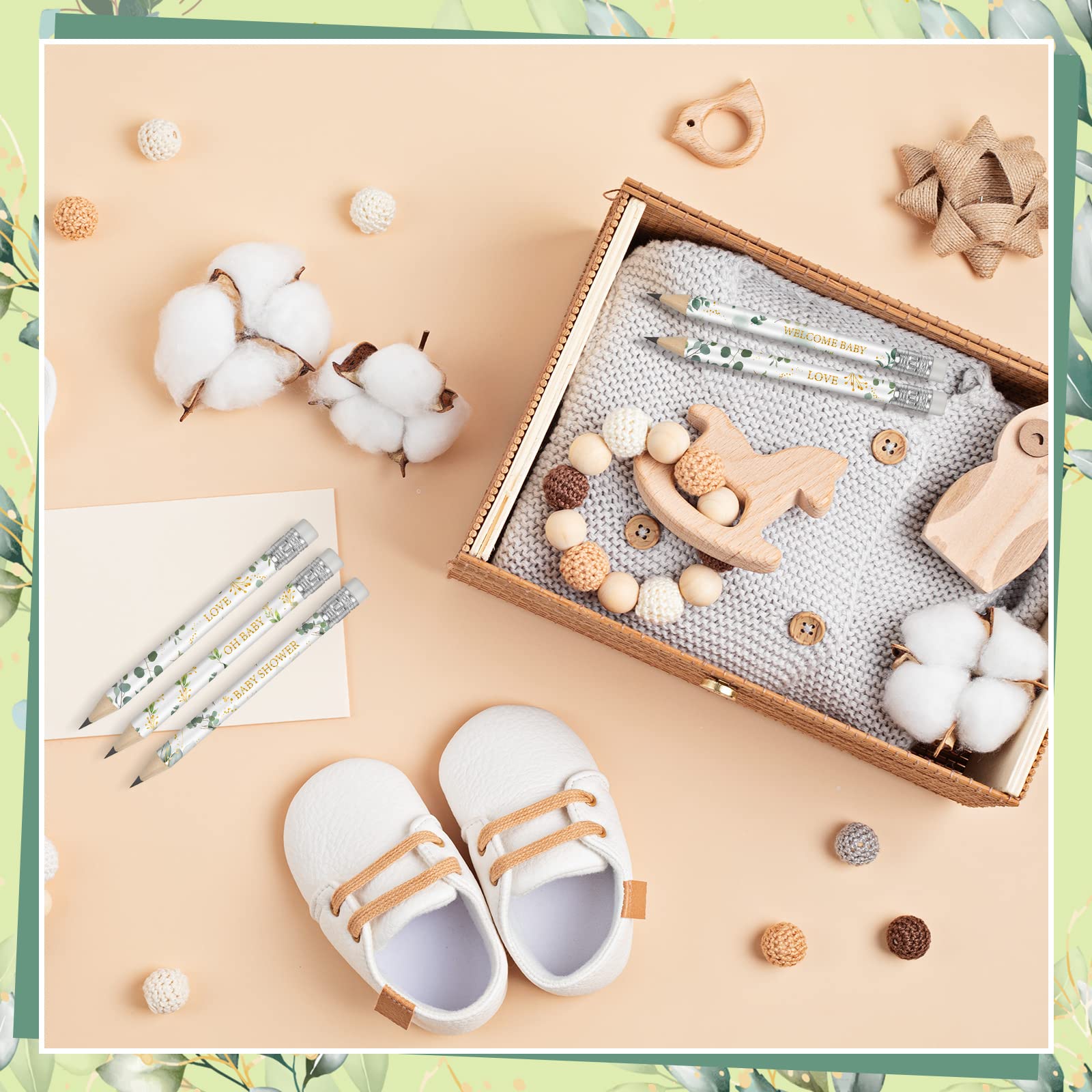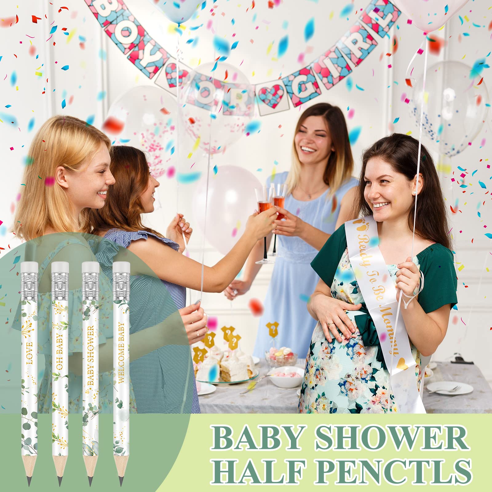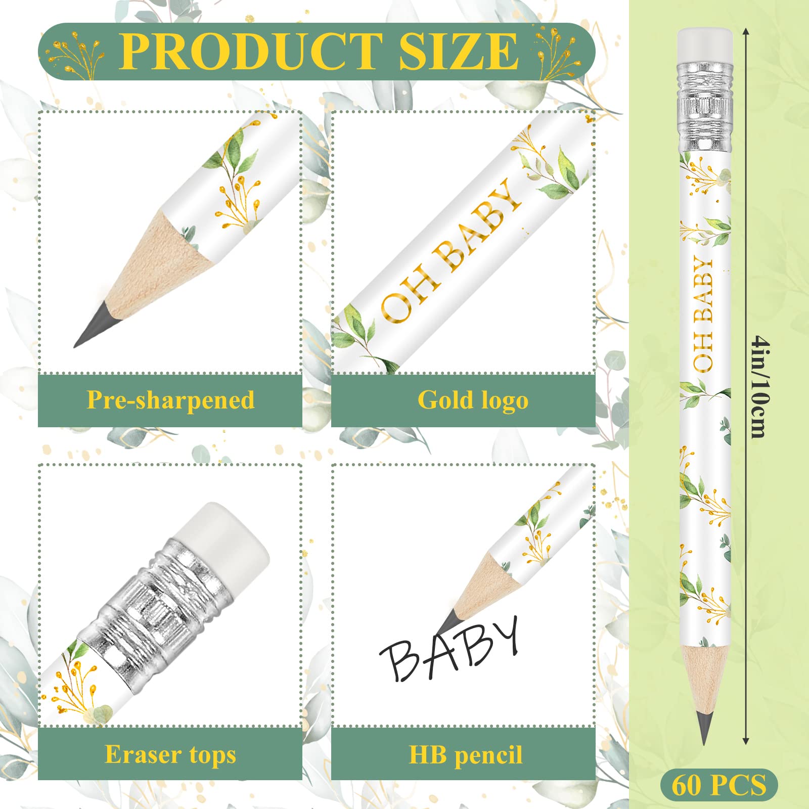 • Q: How many pencils are included in the package, and what styles do they feature? A: The package includes 60 pieces of greenery baby shower pencils, featuring four different styles with themes like 'Love', 'Baby Shower', and 'Welcome Baby'.