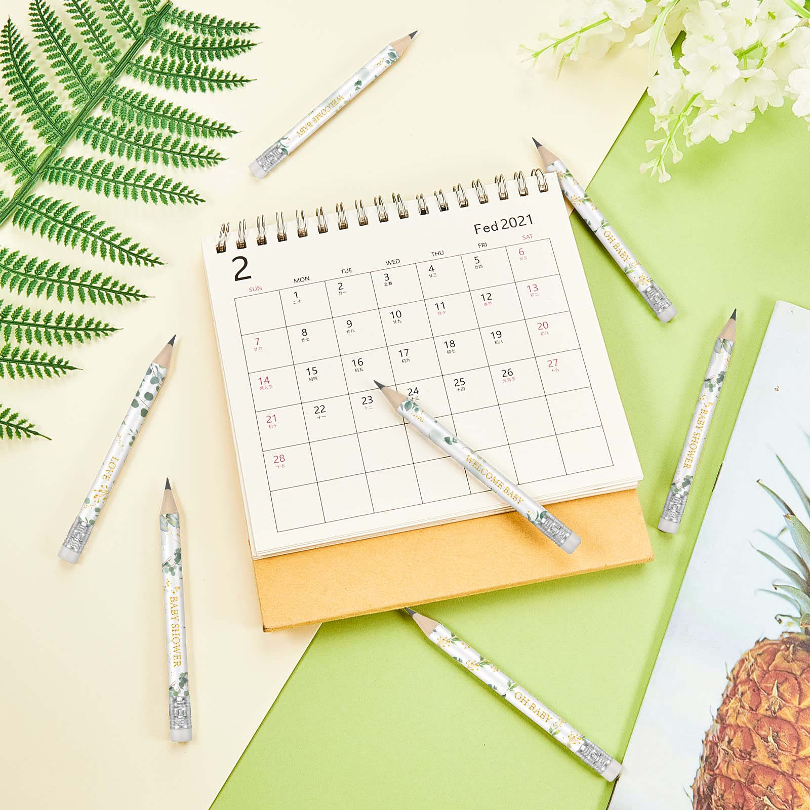 Features: These Mini Wood Pencils Are Designed With Green Leaves, Look Vivid And Lovely, Will Bring A Warm Atmosphere To Your Baby Shower. Made Of Quality Wood, The Golf Pencils With Erasers Are Qualified And Reliable, Not Easy To Break Or Deform, And With Nice Workmanship, The Printing Patterns Are Not Easy To Fade, Offering You A Long Time Of Use. You Can Send These Short Pencils With Erasers To Your Family, Friends, Neighbors, Coworkers And Other People On Baby Shower, Wedding, Home Warming Party Favors. Specifications: Material: Wood Color: As Shown In The Picture Size: 4 Inches/ 10 Cm In Length Package Includes: 60 X Greenery Baby Shower Pencils Notes: Manual Measurement, Please Allow Slight Errors On Size. The Color May Exist A Slight Difference Due To Different Screen Displays. Pointed And Small Parts Included, Please Keep Them Away From Kids.
