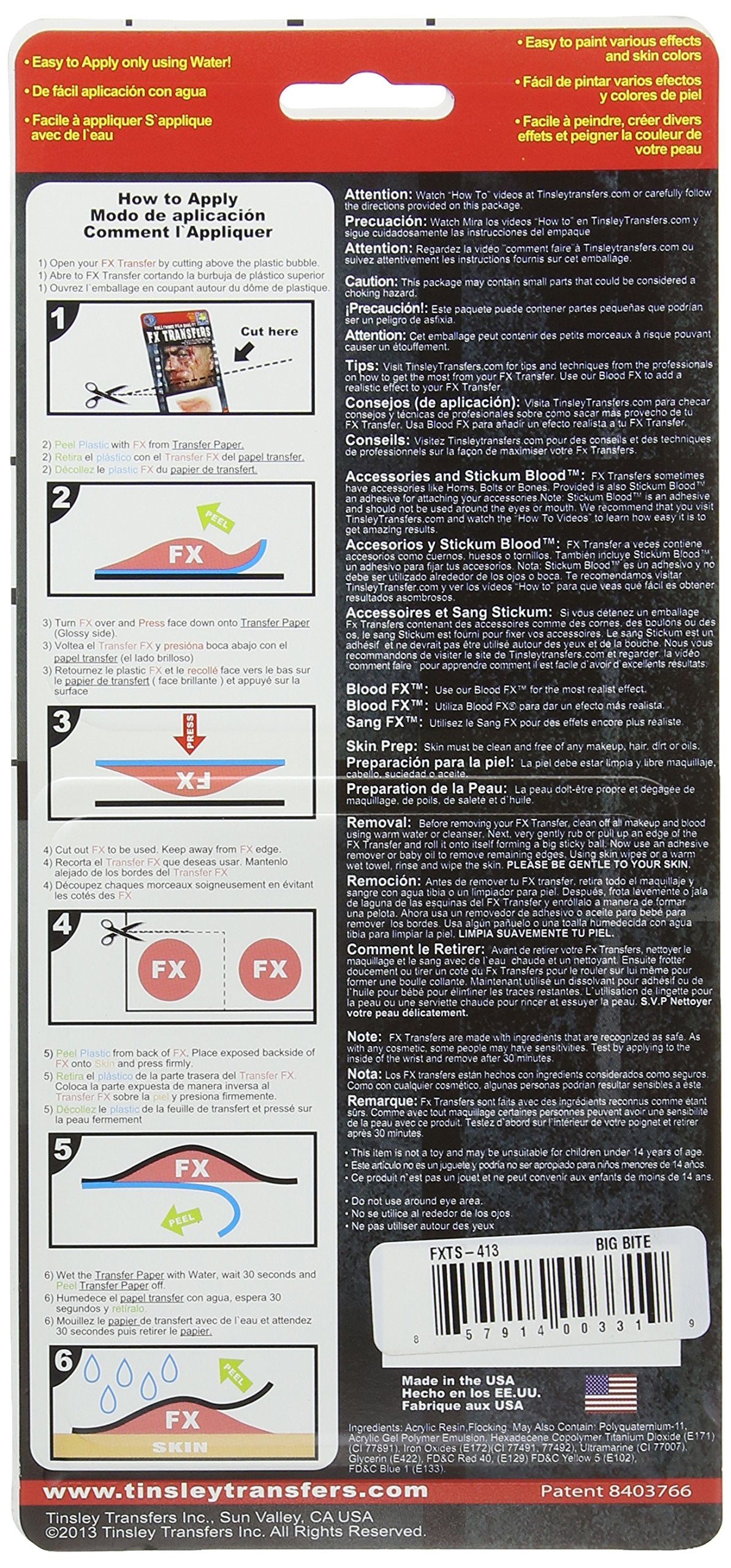 - Q: How do I apply the Tinsley Transfers Big Bite prosthetics? A: Application is simple and user-friendly. You only need water to apply the prosthetics, eliminating the need for adhesives while still achieving a realistic look.