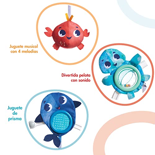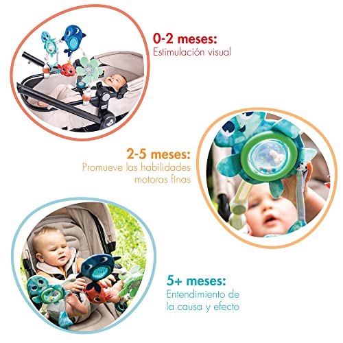 Tiny Loves Treasure the Ocean Musical Nature Stroll Arch offers babies 8 playful activities that provide indoor and on-the-go fun and amusement. The different toys offer your little one audio, visual and tactile stimulation, and their responsive features teach babies the basics of cause and effect, supporting cognitive development. Having a familiar toy when out and about also reassures babies, giving them a sense of familiarity and order in unfamiliar, new surroundings. The universal attachment clip makes this an ideal stroller toy for your little one.Adorable ocean nature arch with 8 engaging developmental activities, including a responsive musical crab that teaches cause and effect, crinkly whale with transparent prism, baby-activated propeller and more. Colors, textures and sounds come together to offer babies rich audio, visual and tactile stimulation, supporting sensory exploration and development.