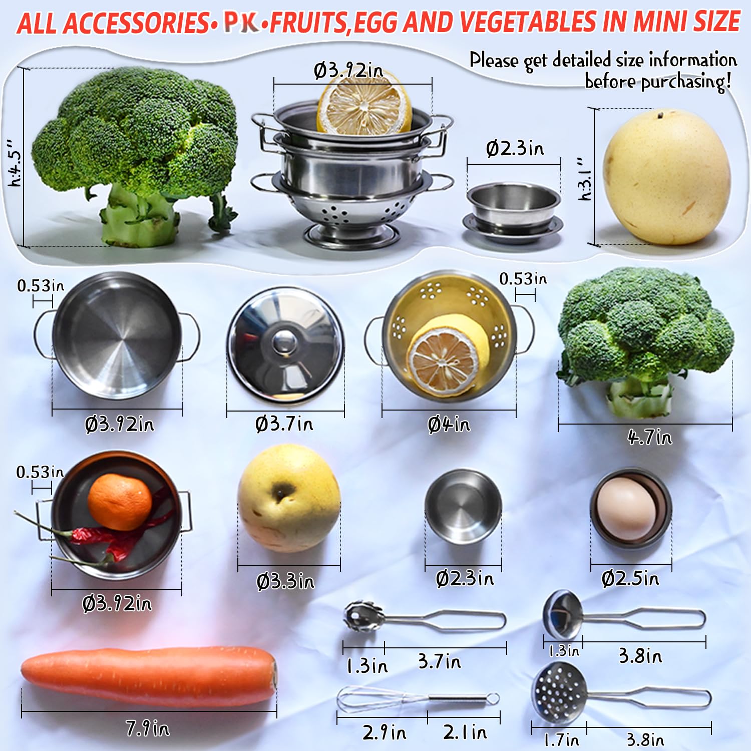 - Q: What should I consider regarding the size of the pots and pans? A: The pots and pans are mini-sized, with a diameter of 4 inches and utensils measuring 5.5 inches long. It's important to refer to the size images provided before purchasing, as they may appear larger in photographs.