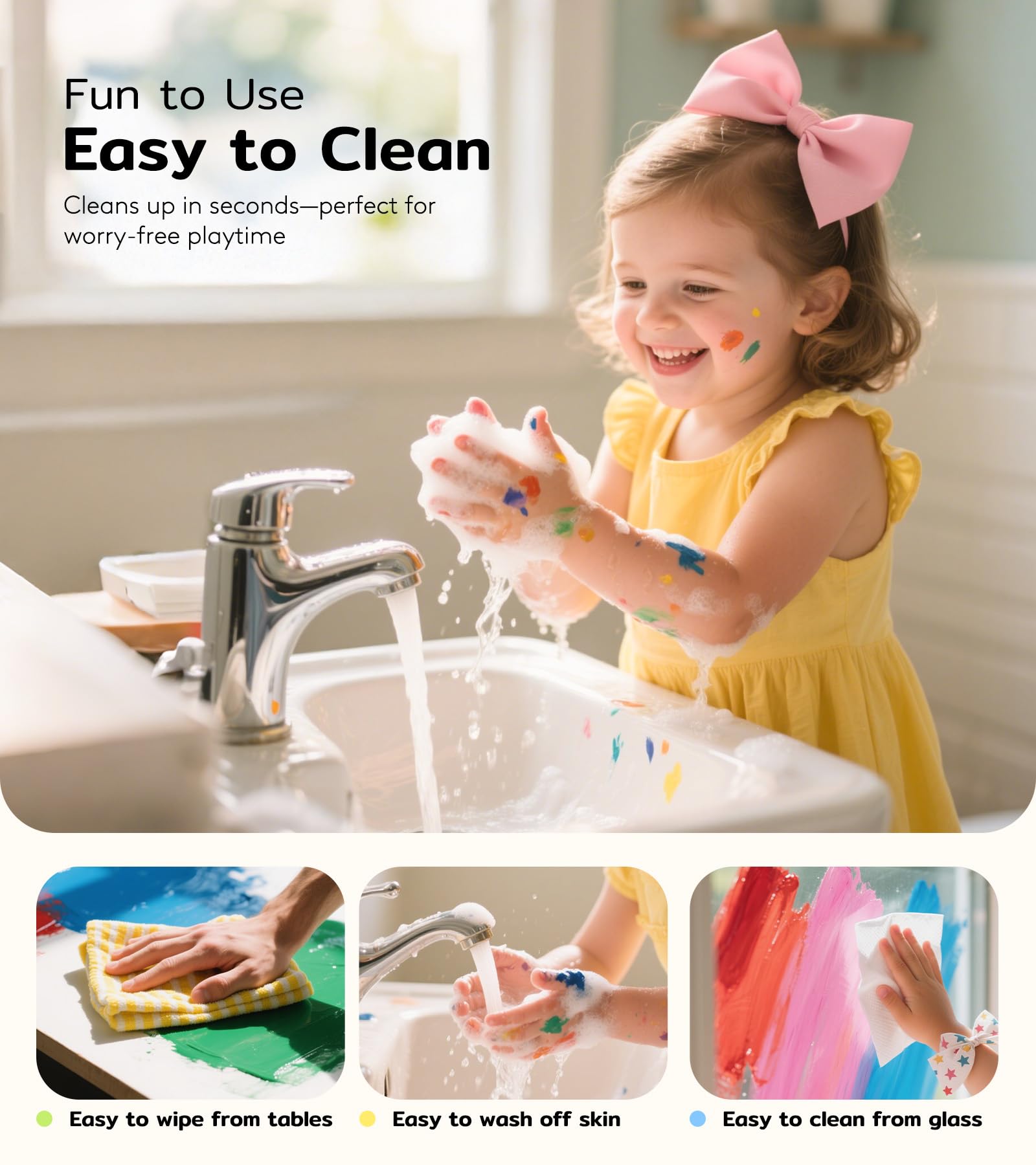 - Q: How do I clean up after using the finger paints? A: Cleanup is easy; the washable paints rinse off skin and non-porous surfaces with water, but avoid porous materials like fabric.