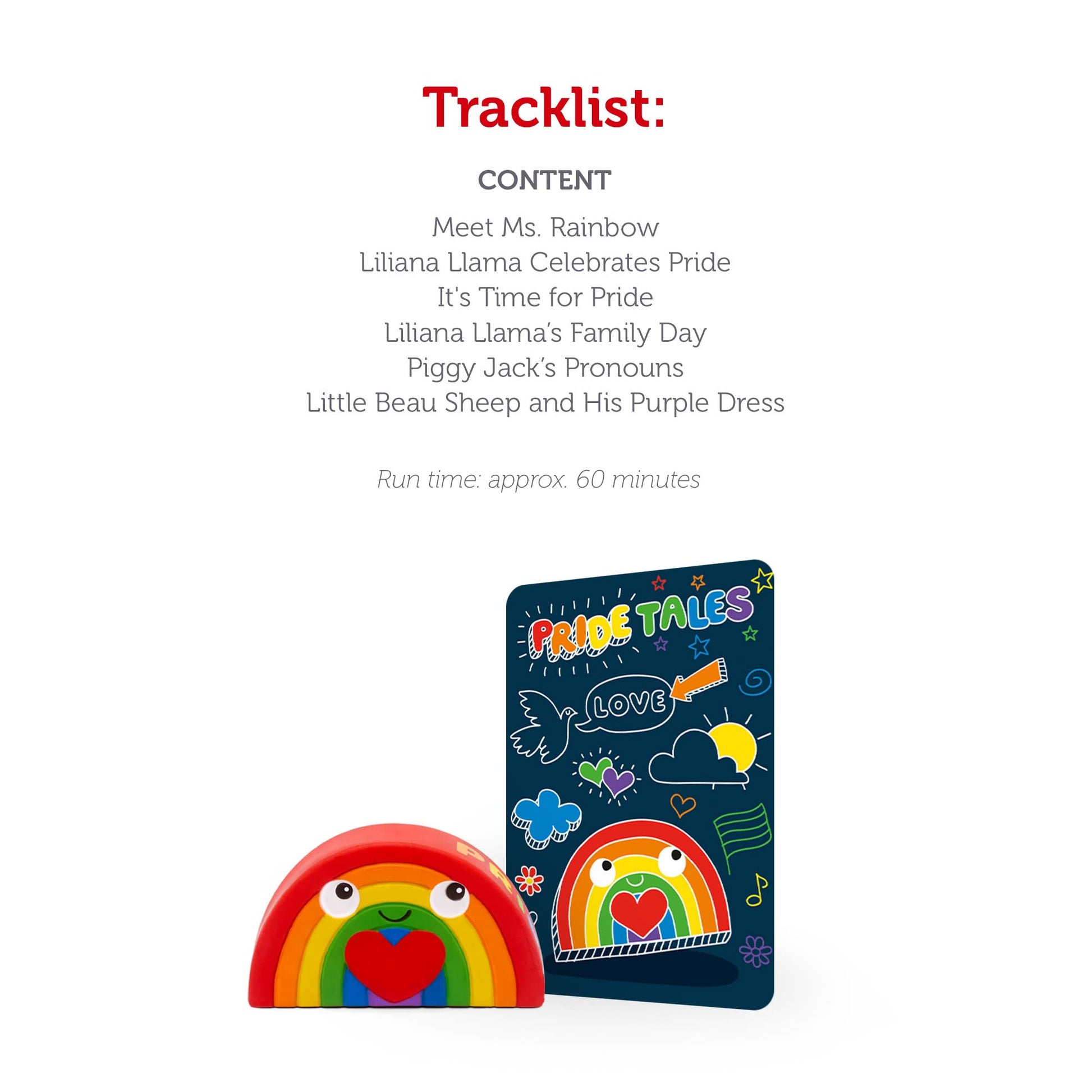 - Q: What stories are included with the Tonies Pride Tales character? A: The Tonies Pride Tales character includes five delightful stories: Meet Ms. Rainbow, Liliana Llama Celebrates Pride, It's Time for Pride, Liliana Llama’s Family Day, and Piggy Jack’s Pronouns. The total run time for all stories is approximately 60 minutes.
