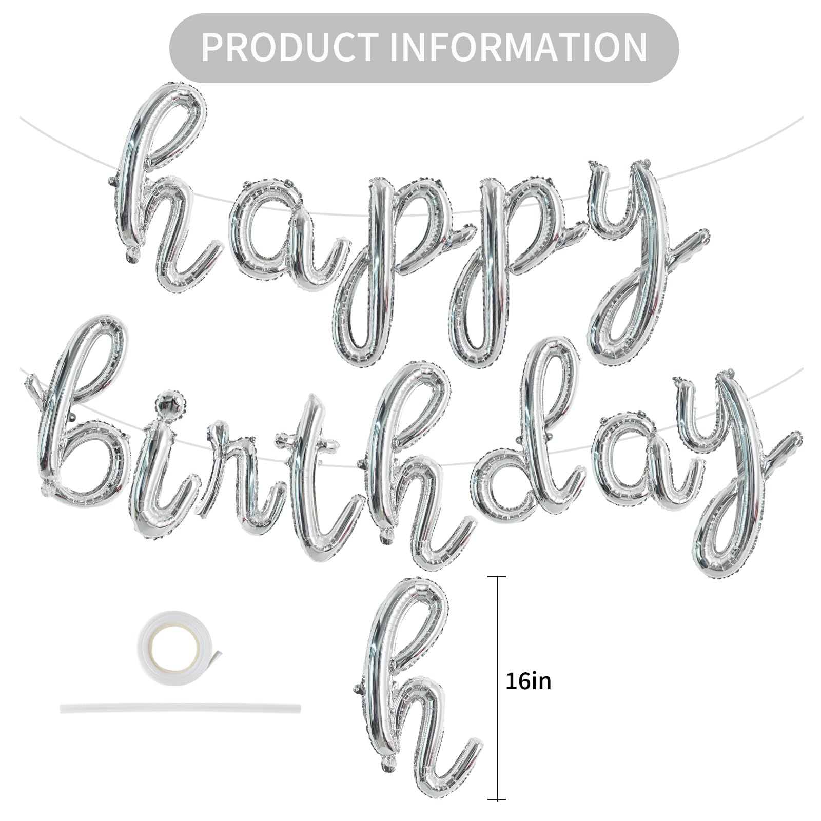 - Q: What size are the silver happy birthday balloons? A: Each letter in the silver cursive happy birthday balloon banner measures 16 inches, making them a prominent decoration for any birthday celebration.
