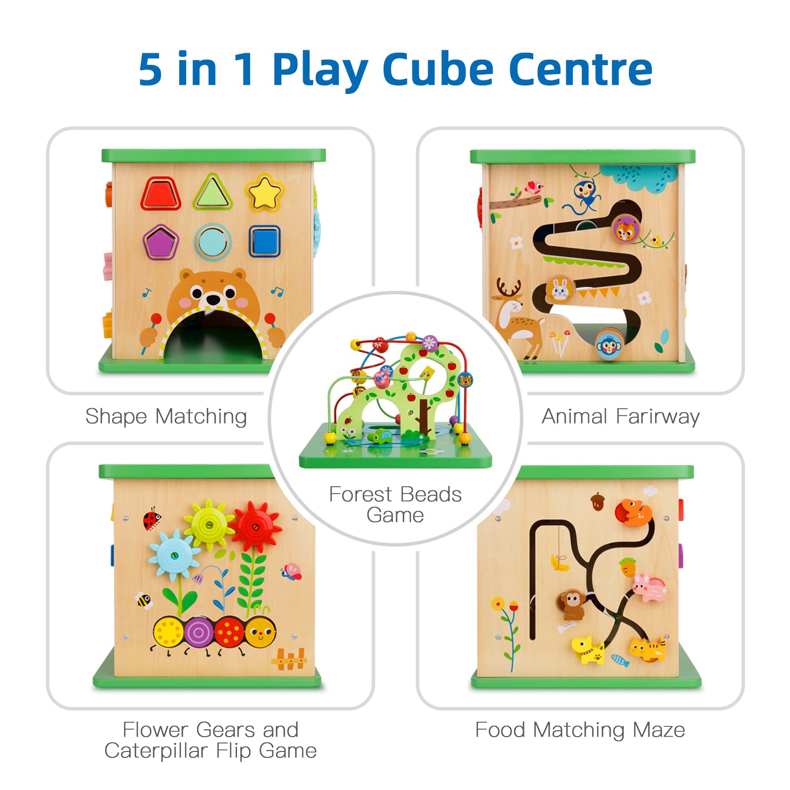 TOOKYLAND 5-in-1 Large Activity Play Cube - Colorful Wooden Learning Puzzle Toy for Toddlers with Animal Friends, Shapes & Mazes