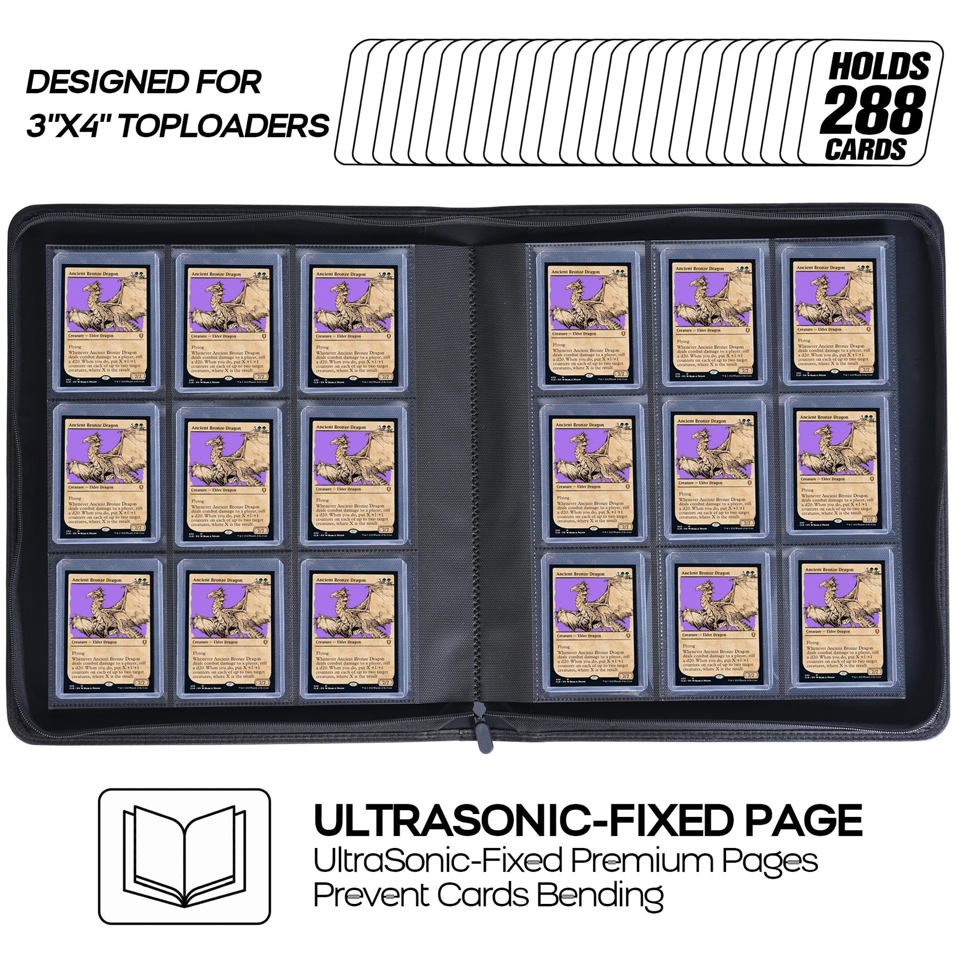 Holds 288 Top Loaders - Our toploader binder holds 288 top loaders enhanced top loader binder with 8 card sleeves and Each page can holds 36 toploaders. Provides plenty of space to keep all your cards organized not disorganized. | Specially Designed for Toploaders Storage & Display - Tailored Made transparent pockets with low-friction backing creating a separation between the front and back pockets as well as providing cards a classic framed look. enhanced Material Clear display on transparent inner pages Convenient and quick search and toploaded card display. | Max Protection for Card Collection - Heavy duty material which makes It more resistant to water and dust Designed to keep card securely in place. Quality zipper keep cards protected and intact when not in use. Padded extra rigid front and rear covers made from non-slip water resistant material. | Long Term Use - Compared to other paper or soft boxes on the market Our graded card binder combines storage and display functions. Our toploader Binder for sports cards can better protect your precious cards collections have a longer lifespan and are convenient for long-term use. | Buy with Confidence - Your satisfaction is our top priority plz rest assured to purchase our 9-pocket toploader binder. If you are not satisfied with our top loader binder or have any questions please feel free to contact us at any time Let us remove any worry or hassle with our unique money back which means that if you are not totally satisfied with your product we will refund you and you keep the top loader binder.